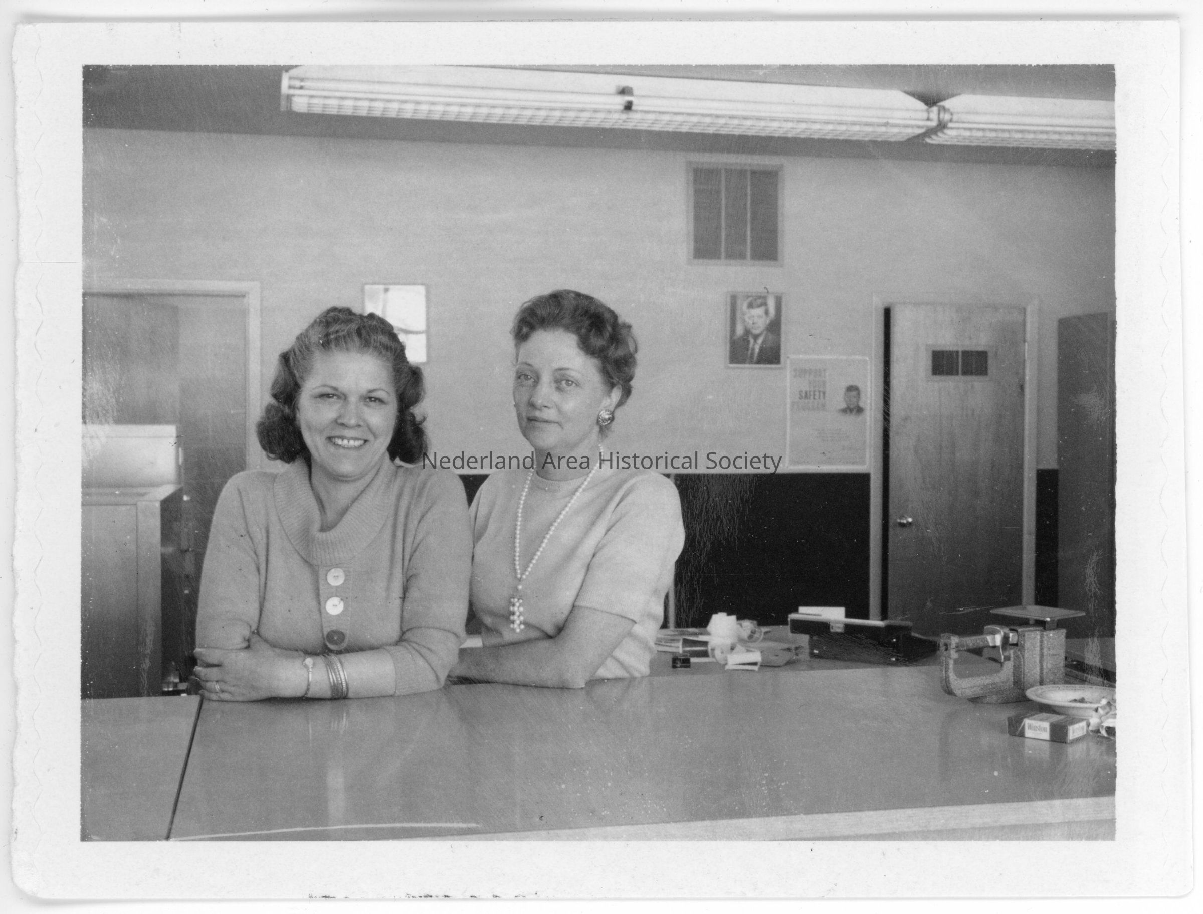 Snapshot of women who worked at the Post Office. Shows the interior of the Nederland Post Office in mid-1960s. Left, Postmaster Julia V. Luedke 1950-1976. Right, Ruby Jackson.Collection