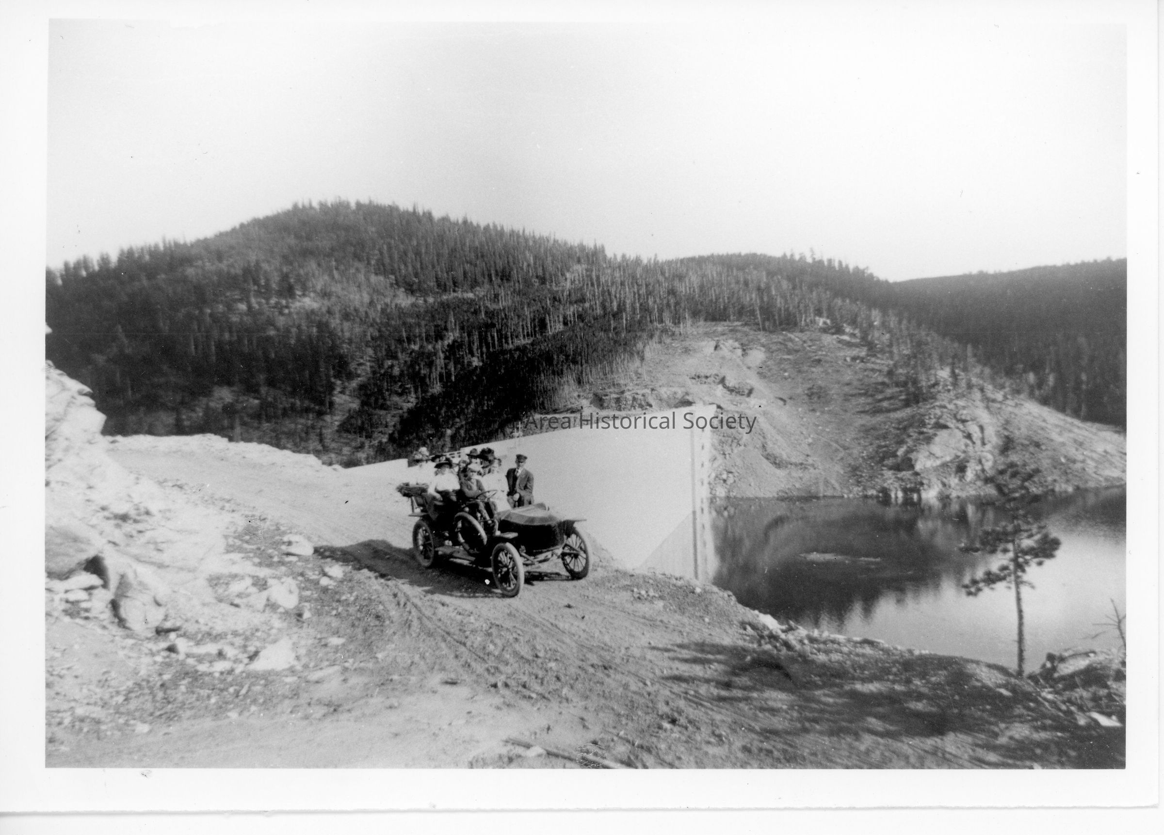 3. Photo of Stanley Steamer with passengers at east end of Barker Reservoir. Violet Norris Forbes identified herself as the high school girl in the front seat. Mrs. Wolcott was standing behind her. Mrs. J.G. Clark was the woman in the white dress in the back seat with Mrs. Ed Norris. She thought her brother, Prentiss Norris, was standing beside Mrs. Wolcott. Photo is labeled Sunday, June 4, 1911. (Also a smaller copy of same photo 2024.22.5 (3a)