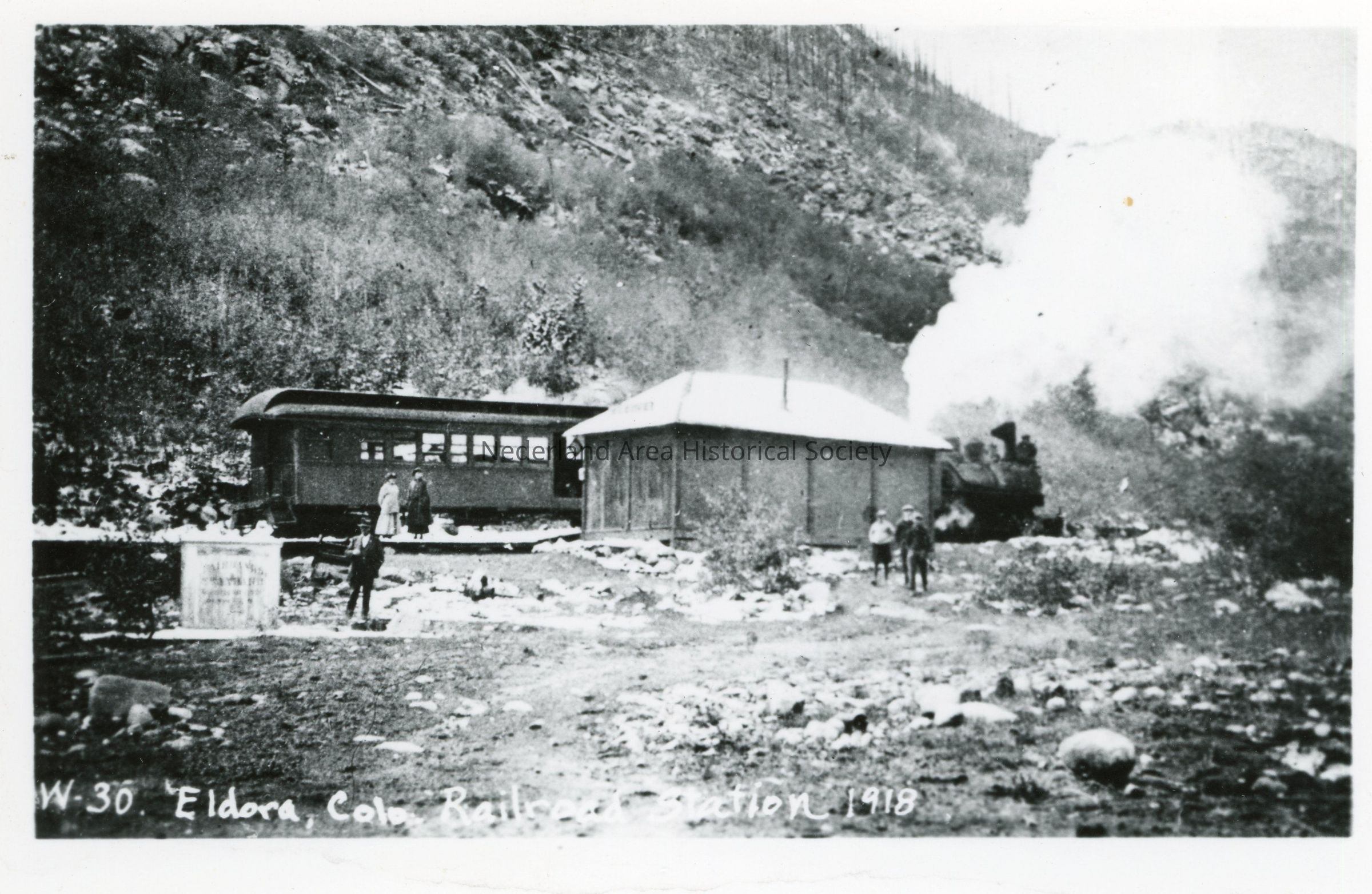 Photo postcard (2 copies) of Eldora, Colo. Railroad Station 1918. Man at left is identified as Eldora's Mayor, Mr. Harpel. Boy in short pants in front of depot is Harold Lilly. At right is Mr. Rugg, Sr.Collection