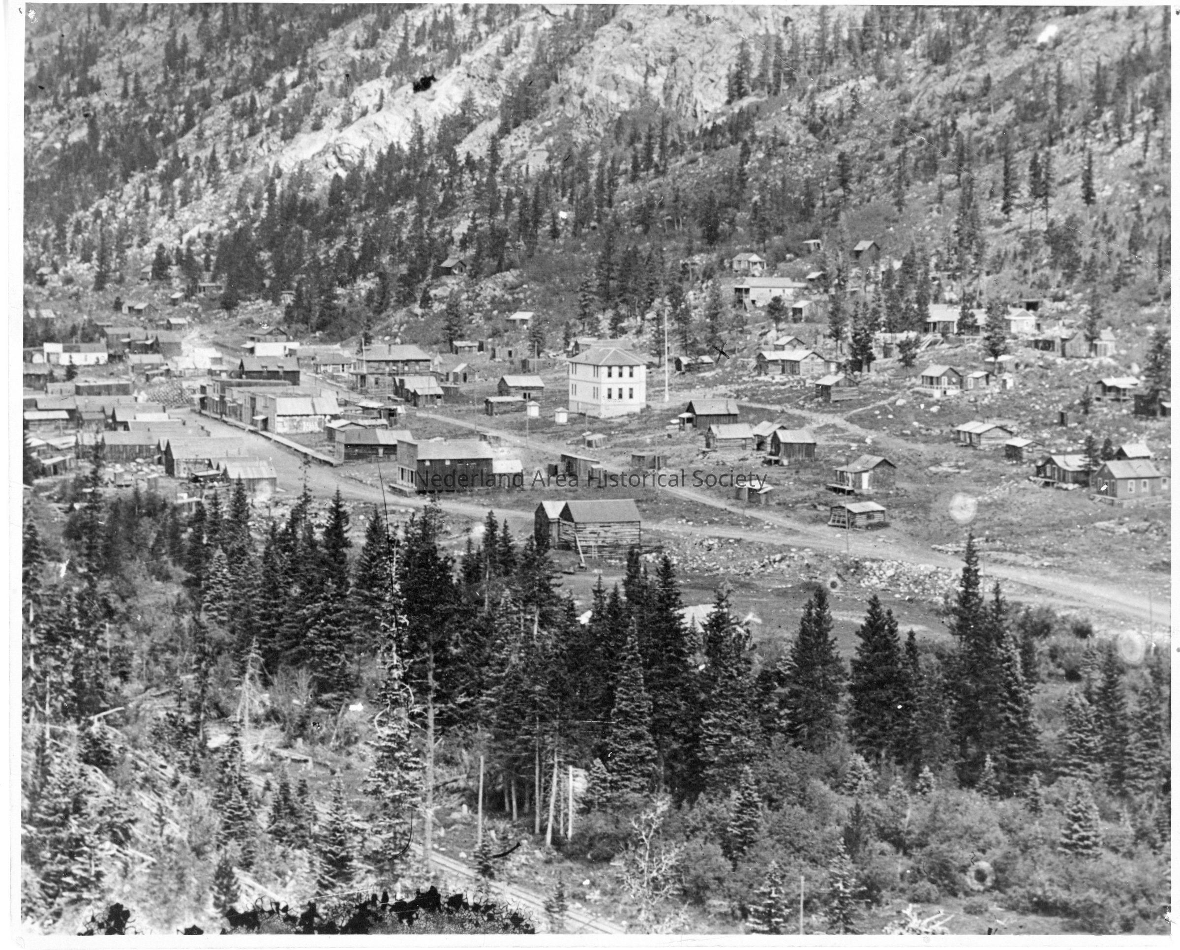 Overview of Eldora (after 1901). Two-story white building is the schoolhouse. Black and white photo.Collection