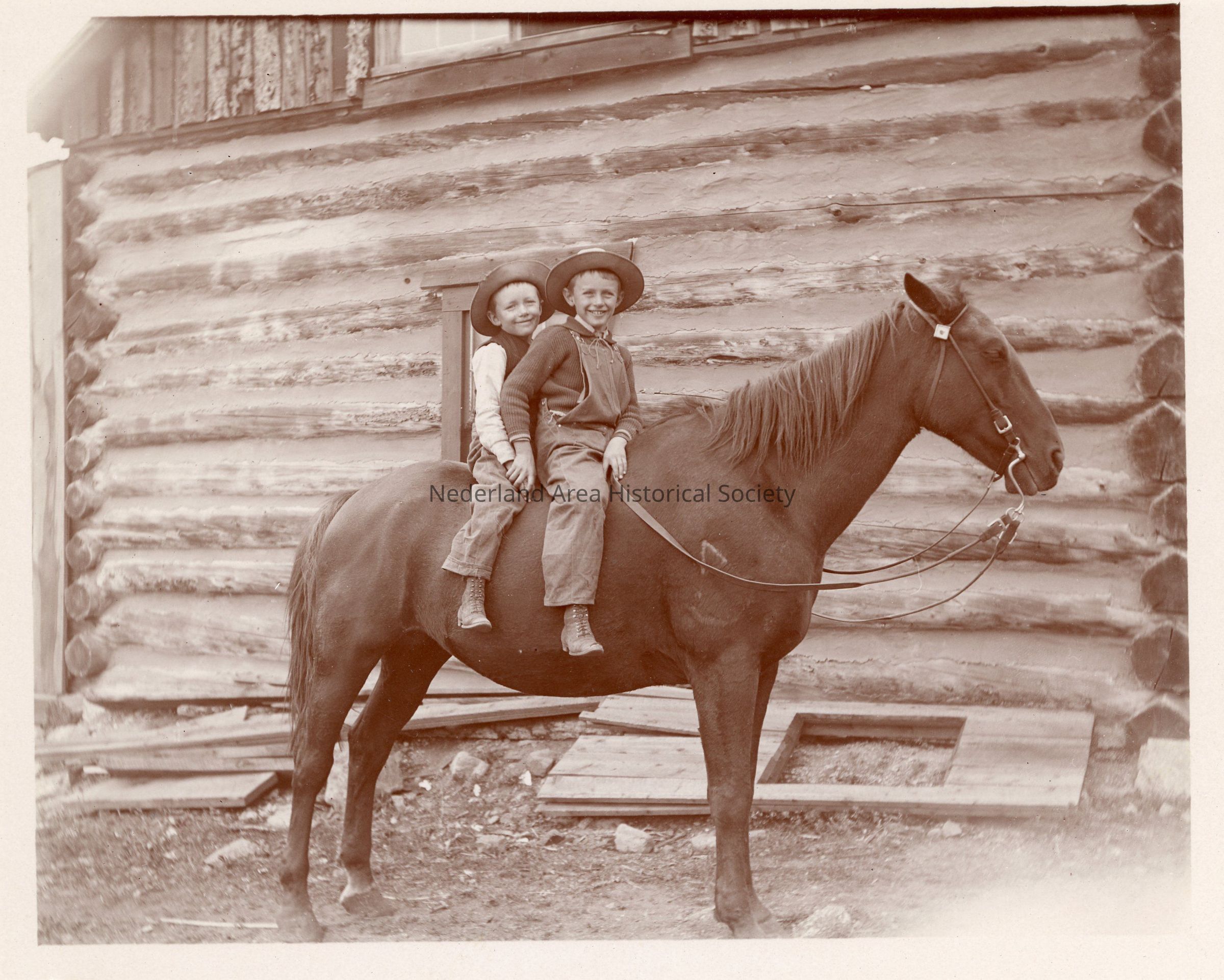 2. Don and Robert Kemp on horse at the Kemp cabin, c1900. Photo by Harry H. Lake. 4"x5" 'solio' print.