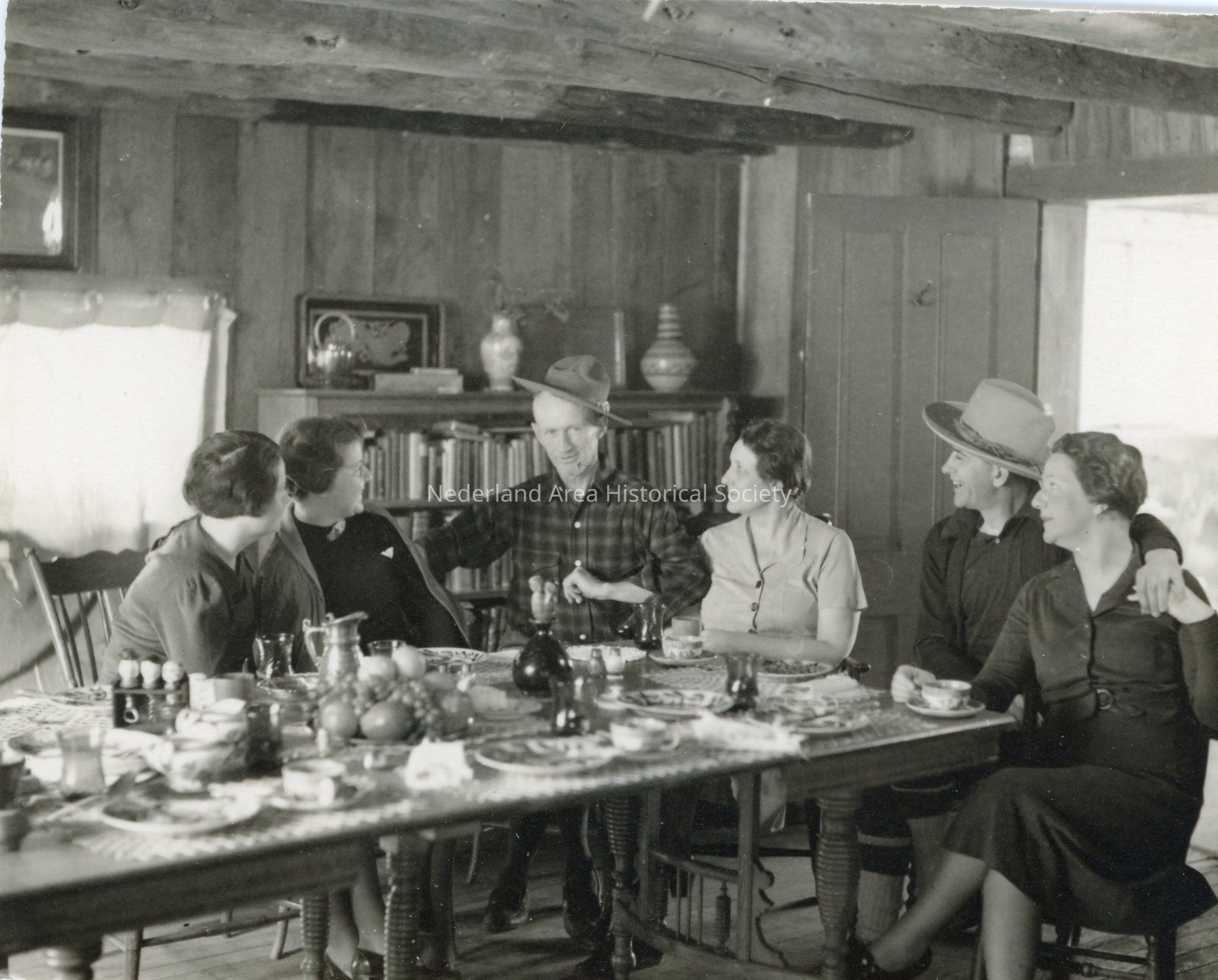 7. Inside the Kemp cabin, Lois Kemp in center, other people unknown. 3.5"x3" print
