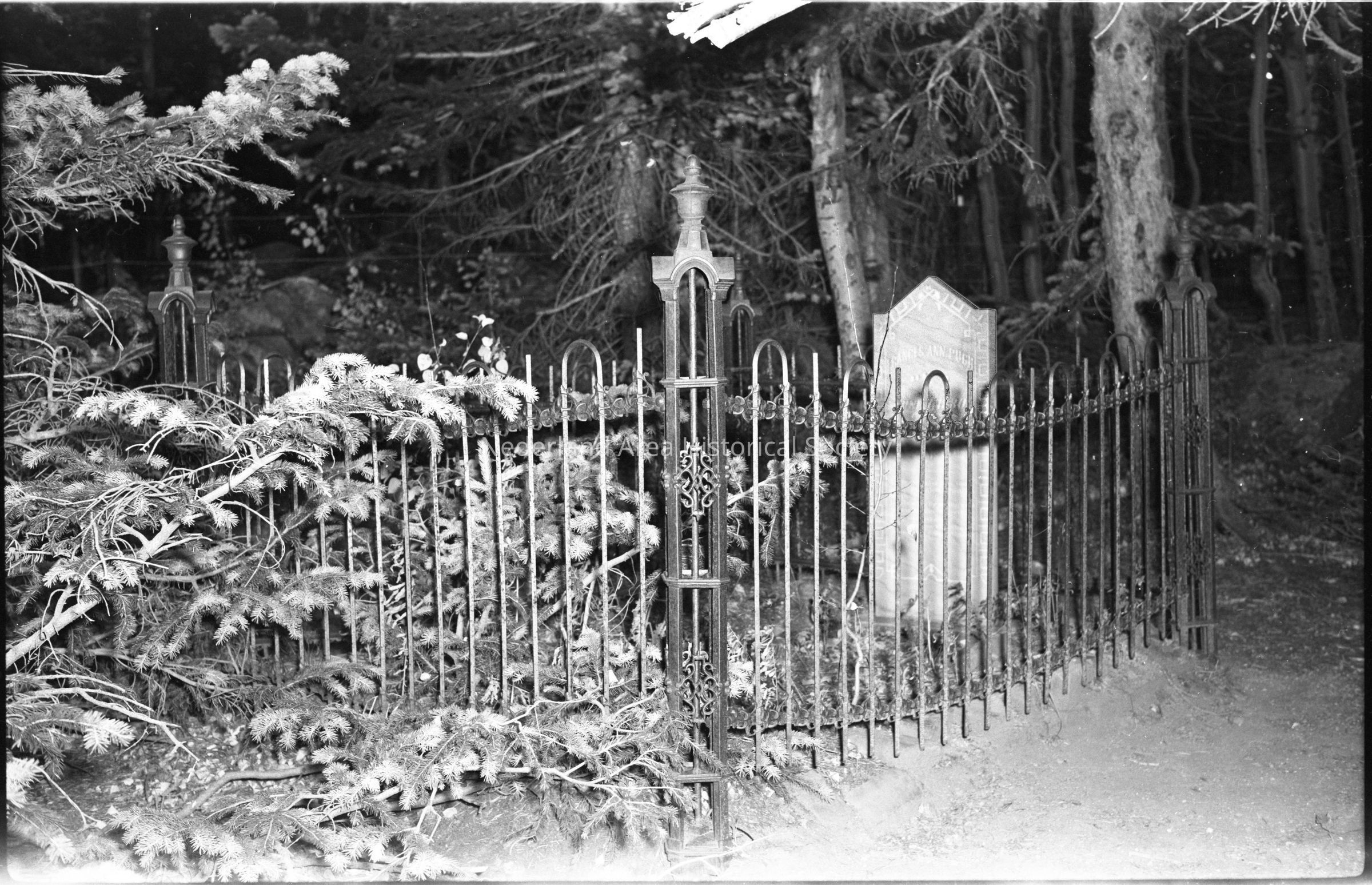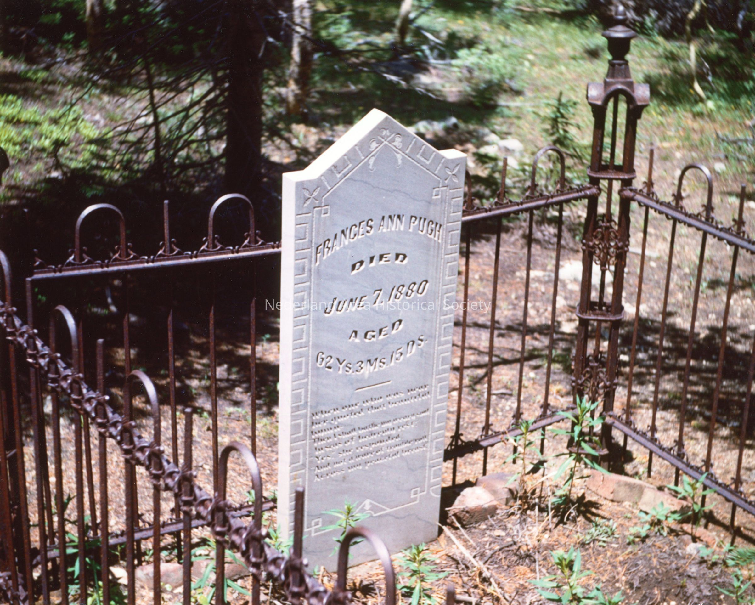 Frances Ann Pugh gravestone and fence in Caribou cemetery. Inscribed: Frances Ann Pugh died June 7, 1880, Aged 62 Ys, 3 Ms, 15 Ds