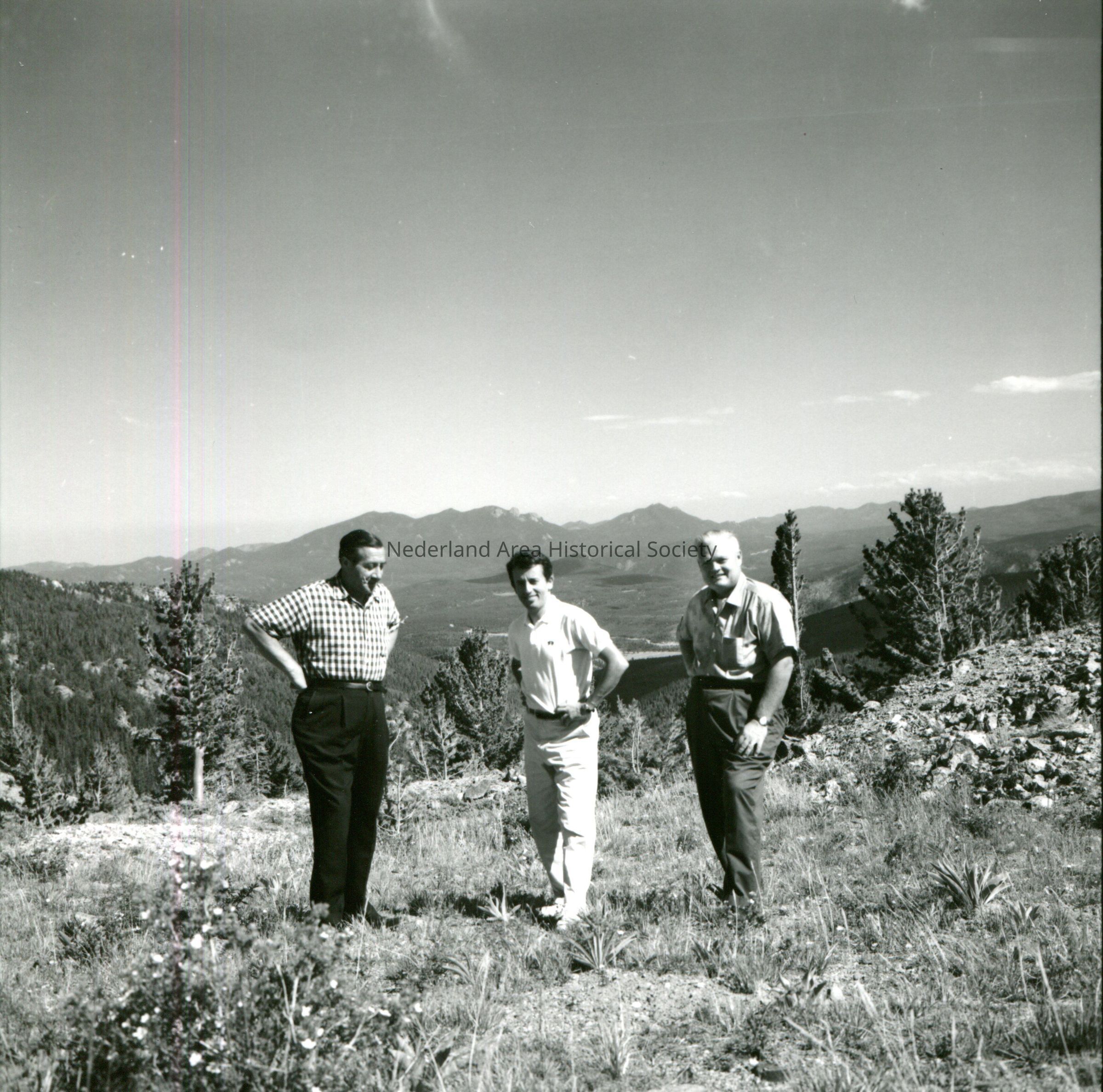 3 men standing above Caribou, Colorado, townsite (man in center is identified as Bernard Dresner of Paris, France)