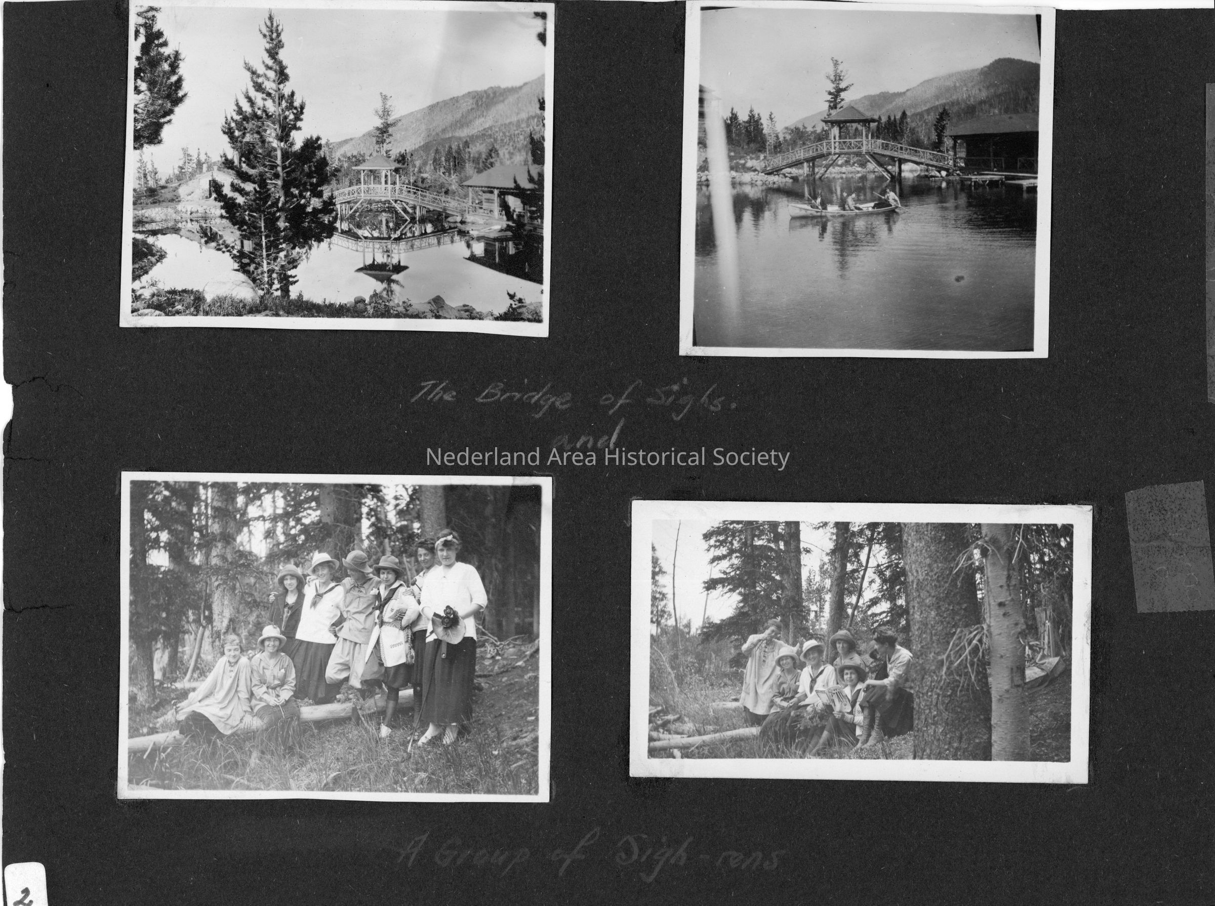 Page 1: Top left photo is labeled: "Lake Eldora". Bottom left: "Some of the Godesses". Lower right: "Dixie Lodge"
