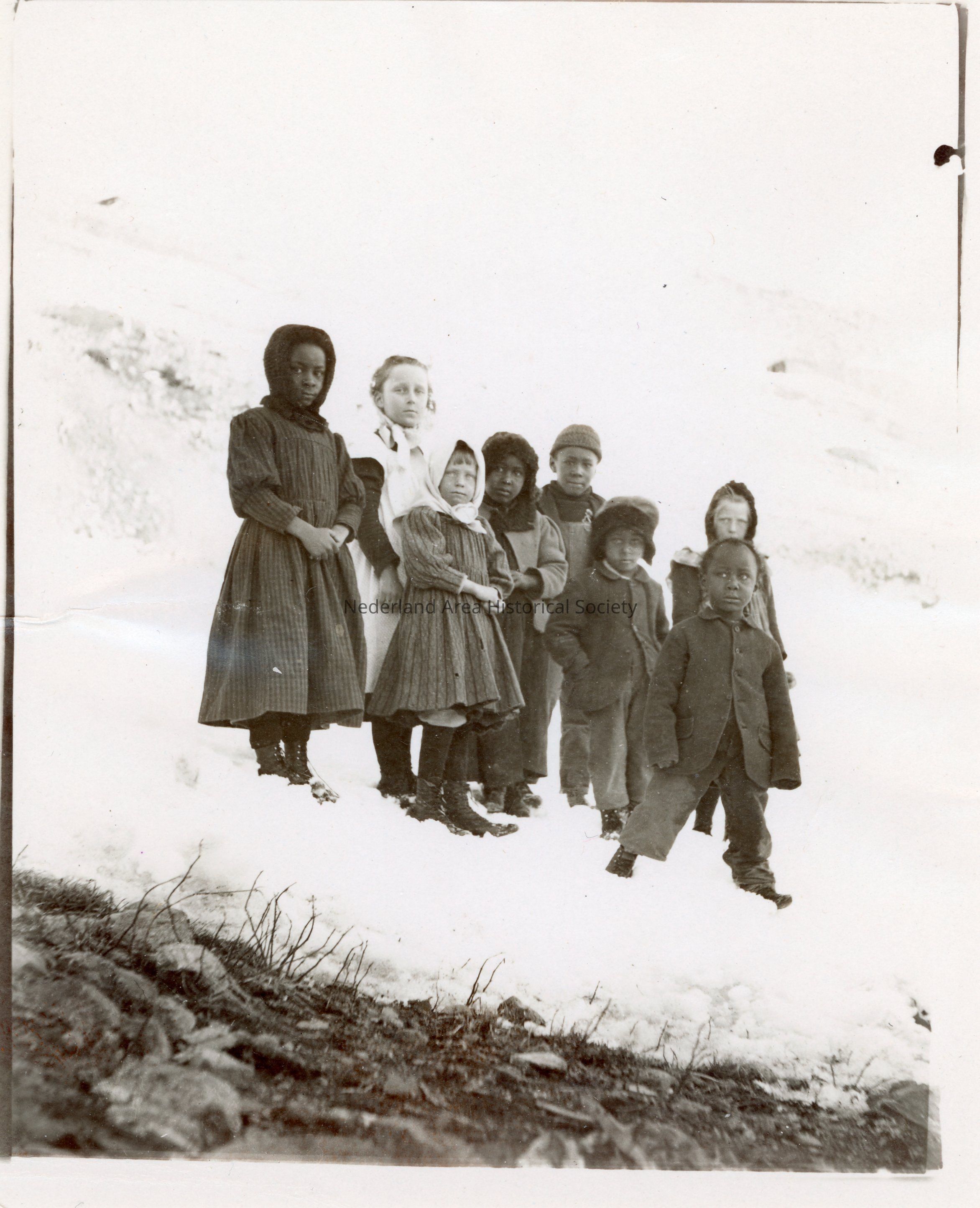 Eight children, five Black and three white, pose for the photographer. They are standing in snow, and several are wearing winter coats. Unknown location or names.Collection