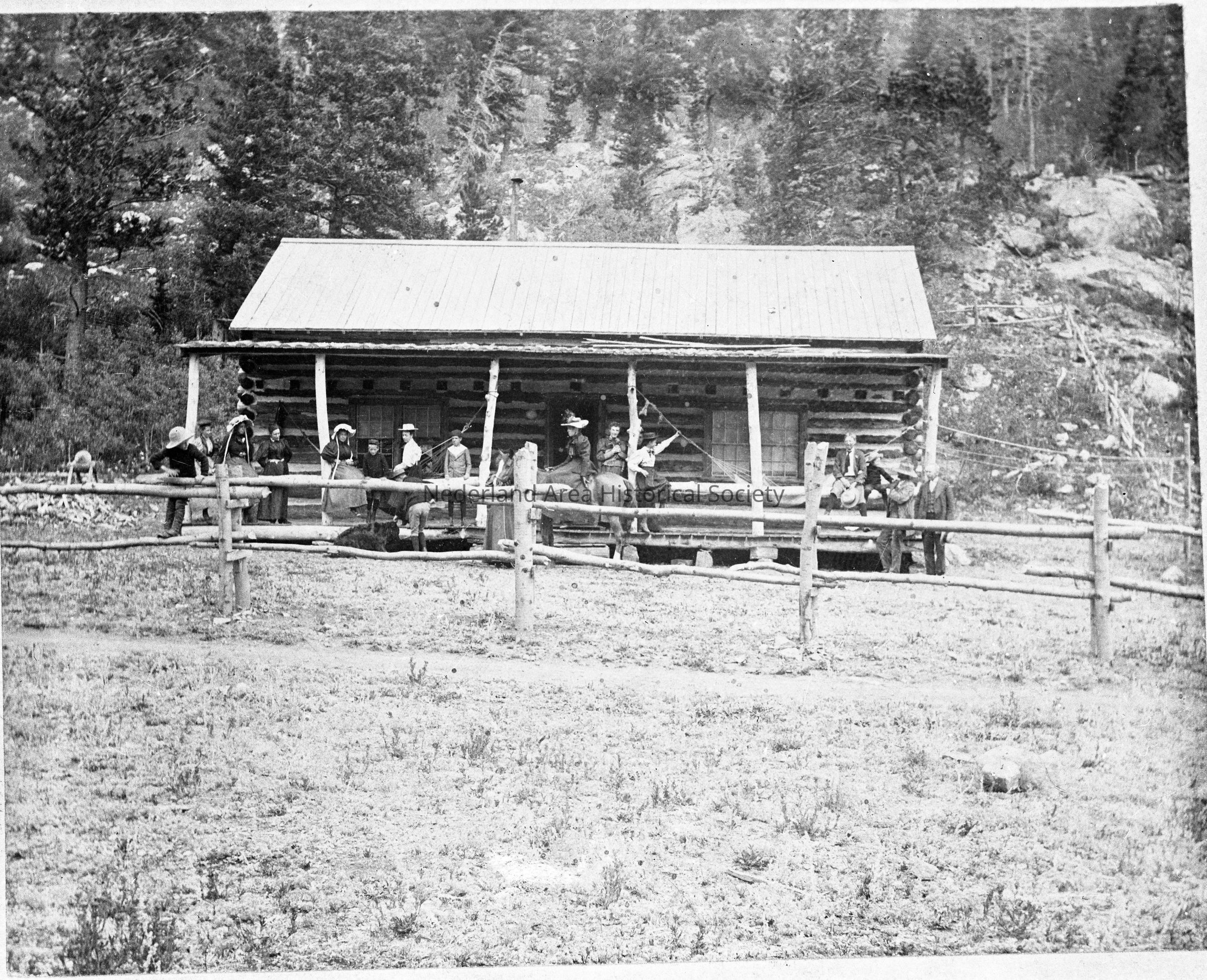 3. Kemp family cabin, with large group of people, summer 1896. People included "Grace, May and Elsie Whitmore, Mr. and Mrs Frederick Kruse and family Clara, Ida and Walter. The Kemps incl. the two boys Don and Robert. Summer 1896." Photographer unknown."(4"x5" negative)