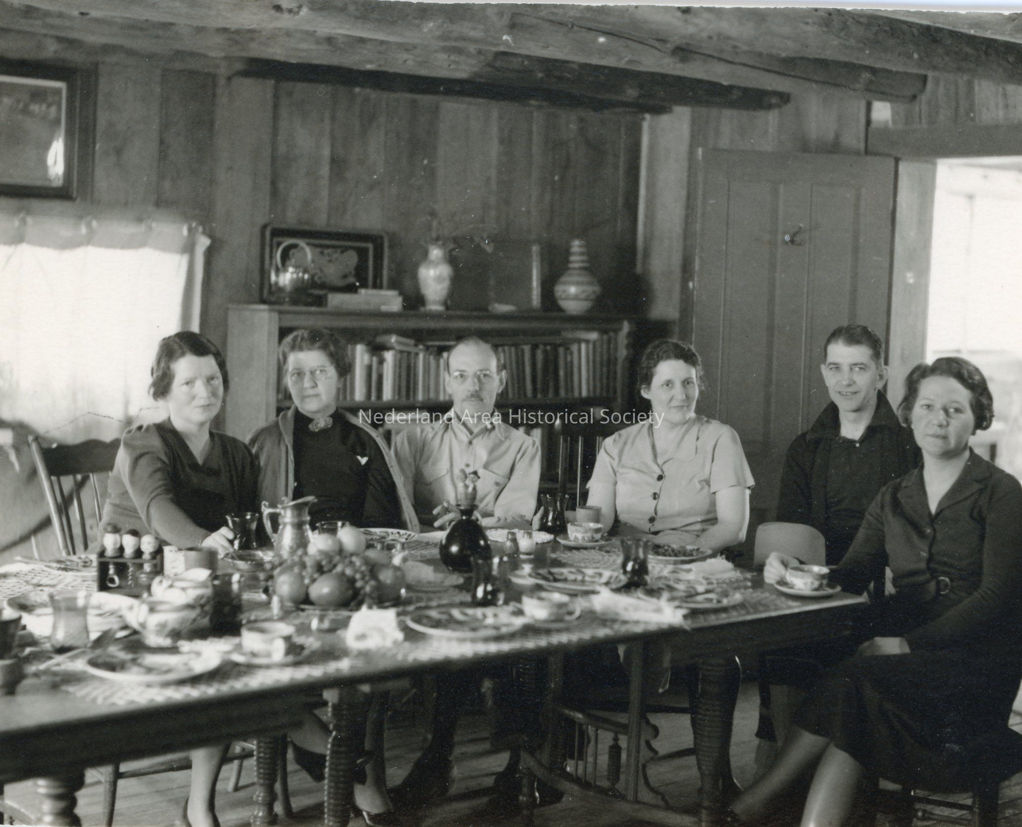 7. Inside the Kemp cabin, Lois Kemp in center, other people unknown. 3.5"x3" print