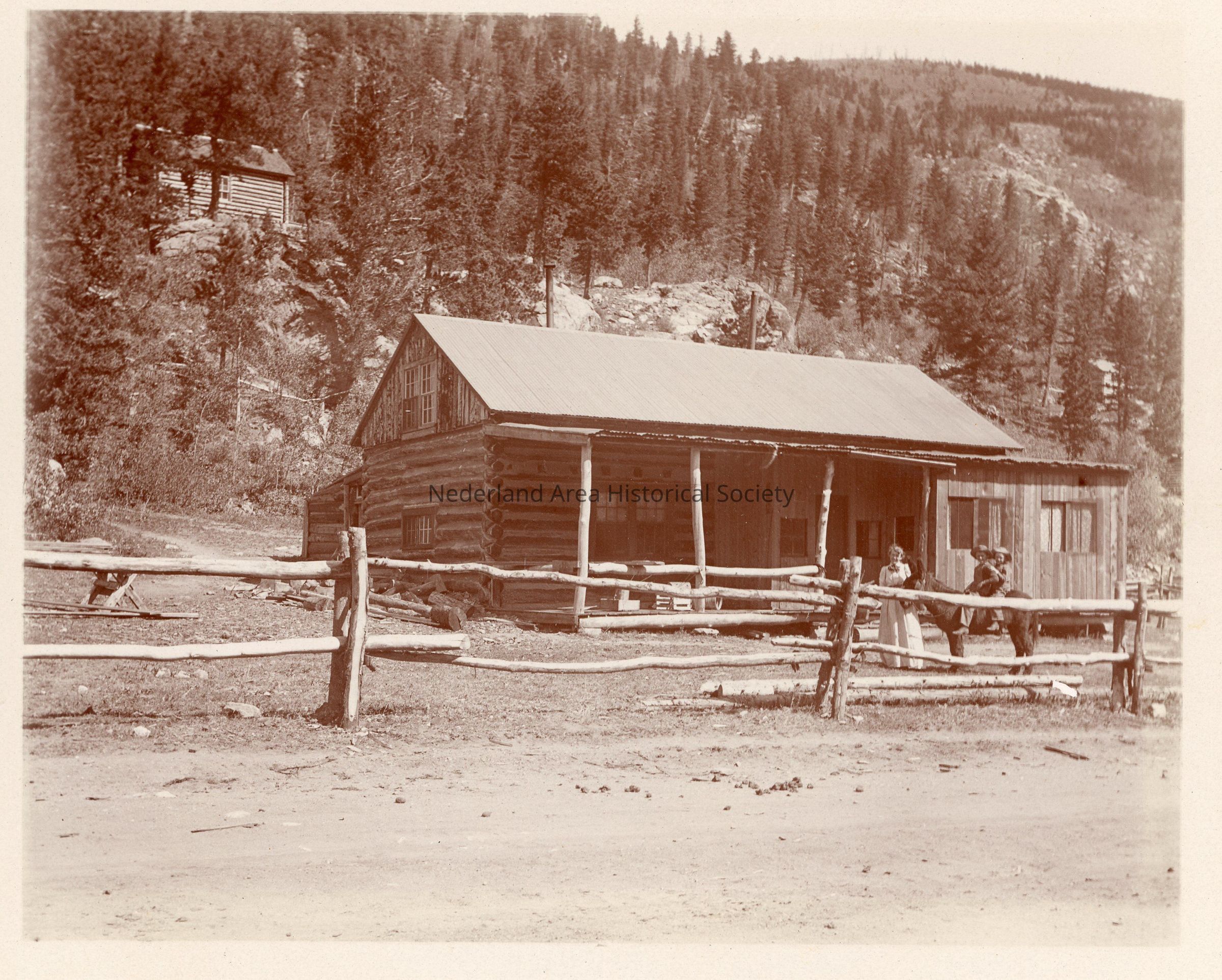1. Kemp cabin, John H. Kemp's wife Jane C. Kemp and sons Donald C. and Robert A. Kemp on J. Moses, the family burro, in front of the four-room Kemp family cabin, August 1899. Photo by Harry H. Lake. (4"x5" negative, a 'solio' print 4"x5", a black and white 5"x7" matted print, and a 6"x5" black and white print with identifications on back in Don Kemp's handwriting.)