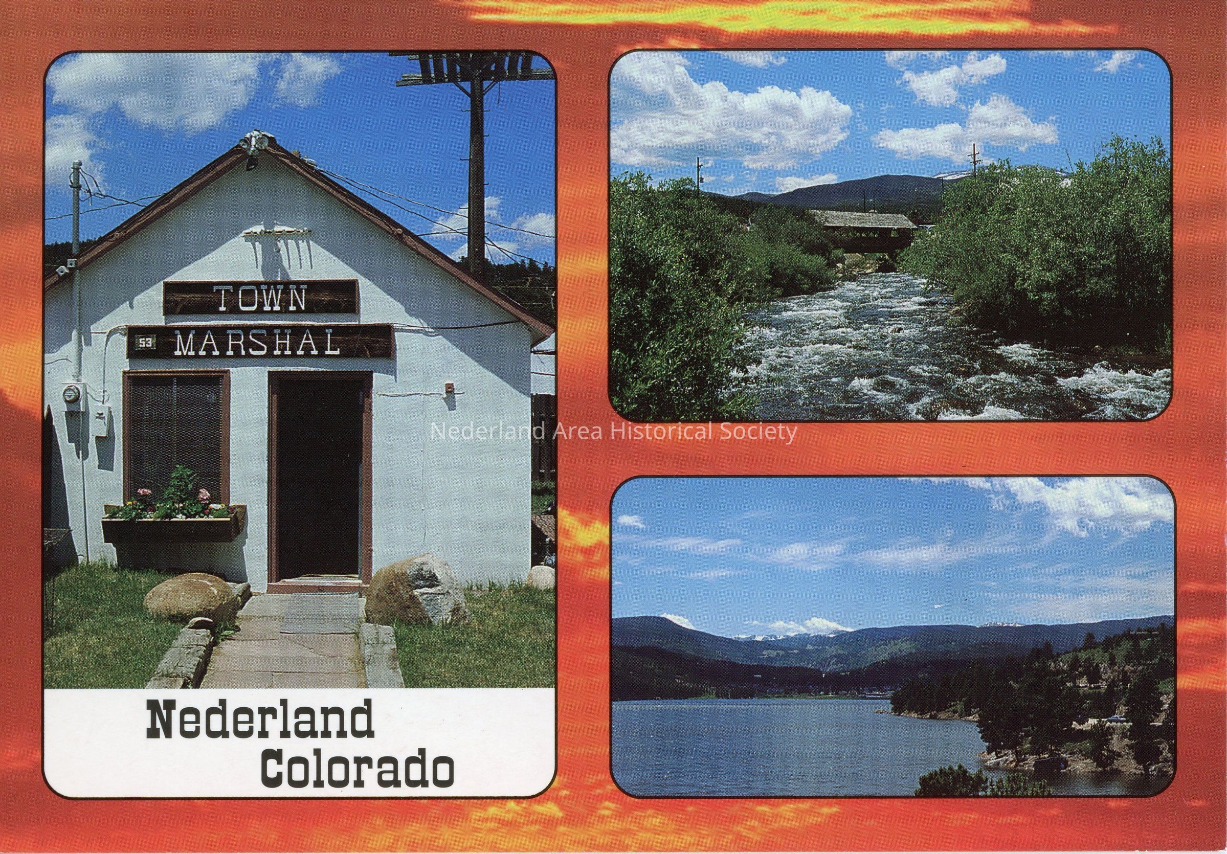 11. Post card showing the town Marshal's office, the covered bridge over Middle Boulder Creek, and Nederland reservoir. Photo by Bob McMillan.