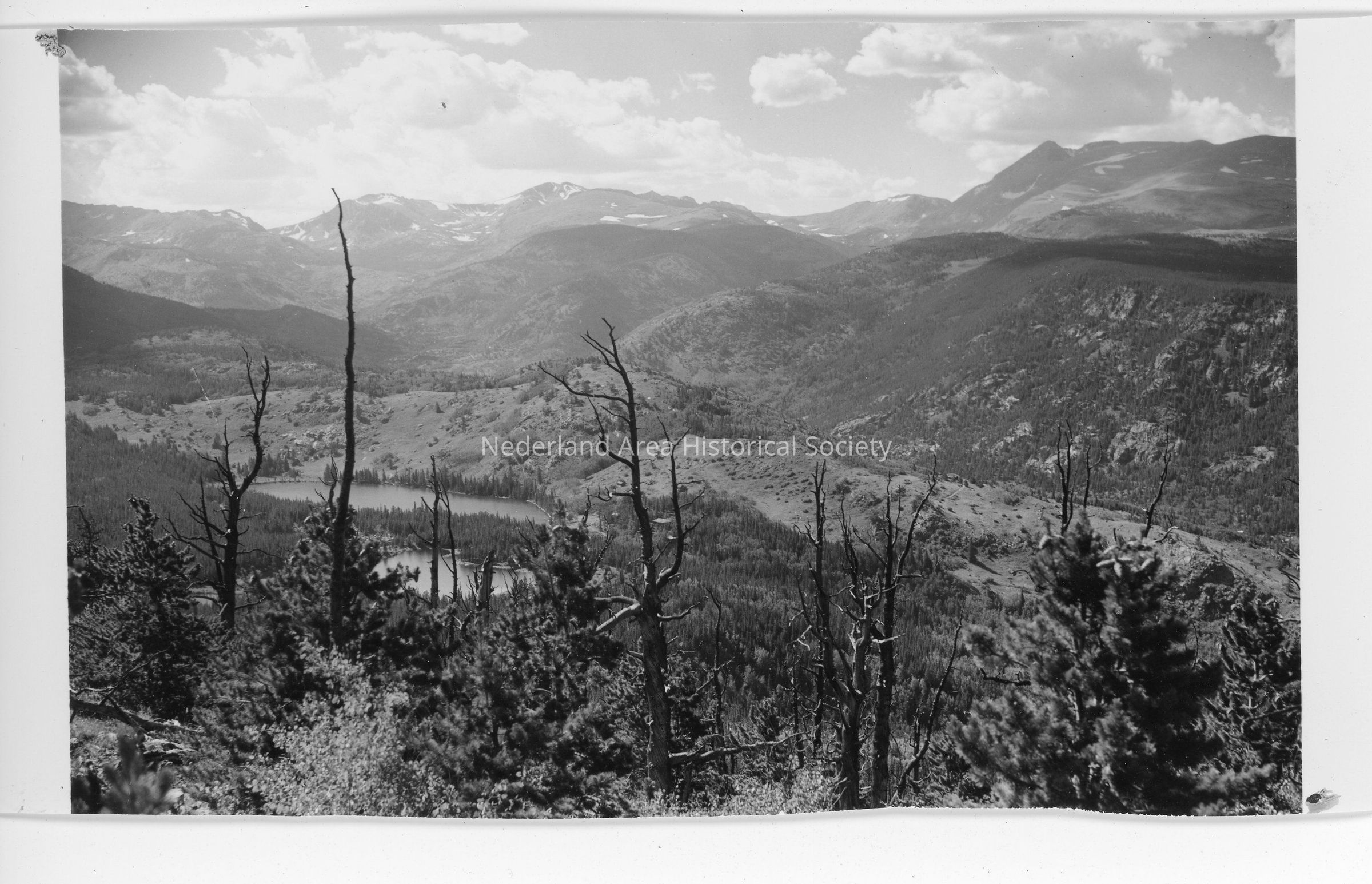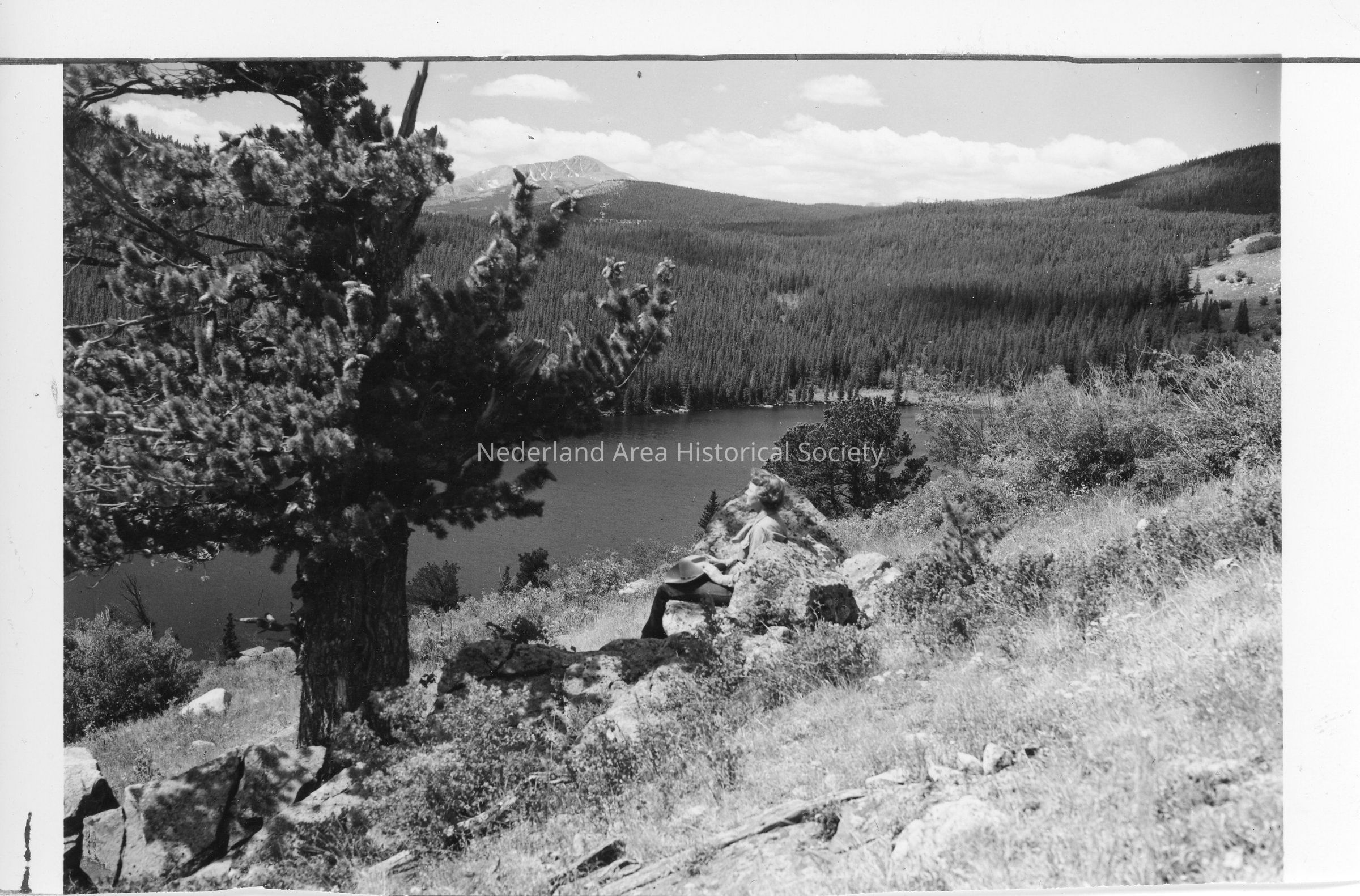 Photo 2 - "Jim Peak and Lake, the reason for the picture", shows James Peak, lake, and young woman sitting on a rock, 5"x3.5"