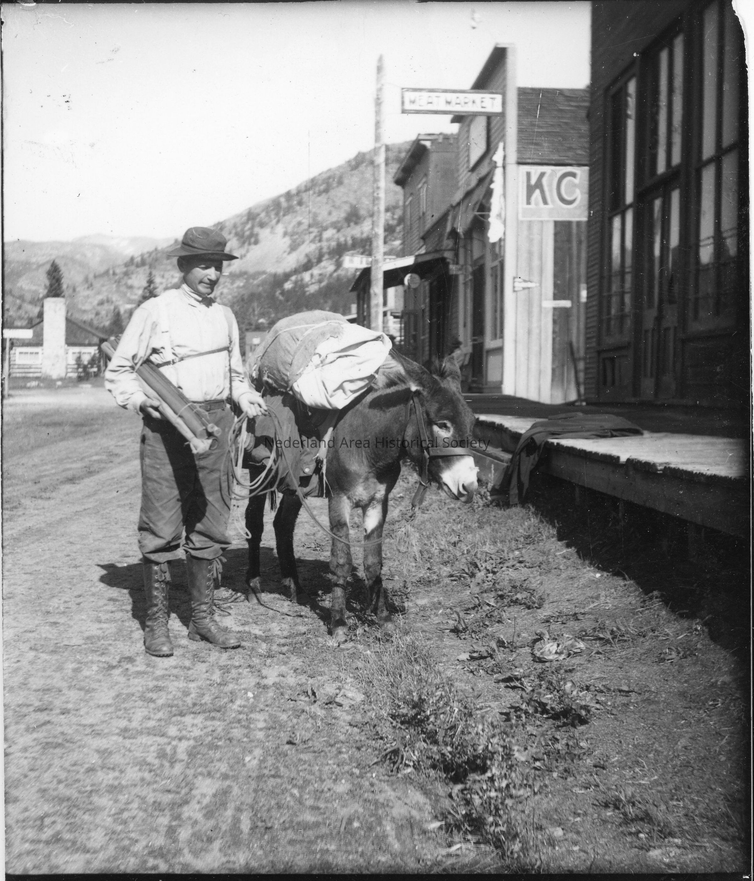2. A man and his pack burro in front of the boardwalk and several stores, including a Meat Market, in Eldora, identified as Bob (?), 1907 (?), Eldora Colo. 4"x5" black and white photo