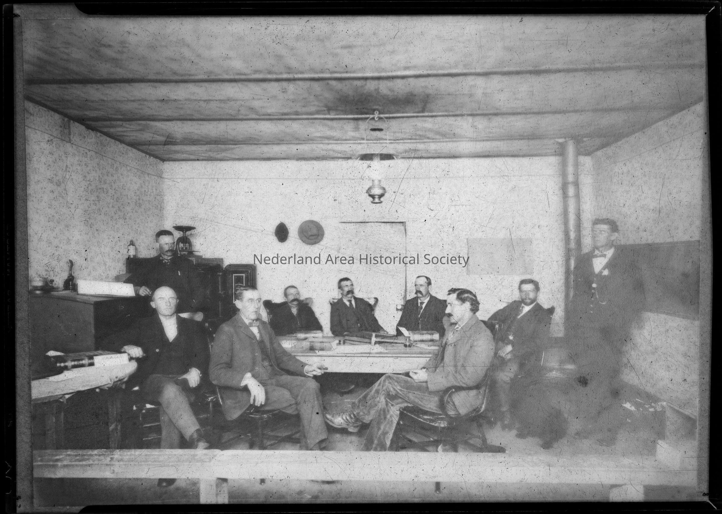 4. Nine men around table identified as "Town Council in Eldora 1899. 5"x7" negative