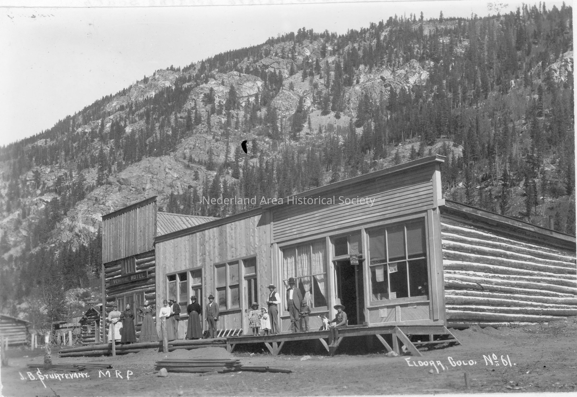 7. Eldora, Colo. No. 61. Photo shows hotel and post office 1899. J.B. Sturtevant photo. 5"x7" print (located in 2024.10.60 page 7)Collection