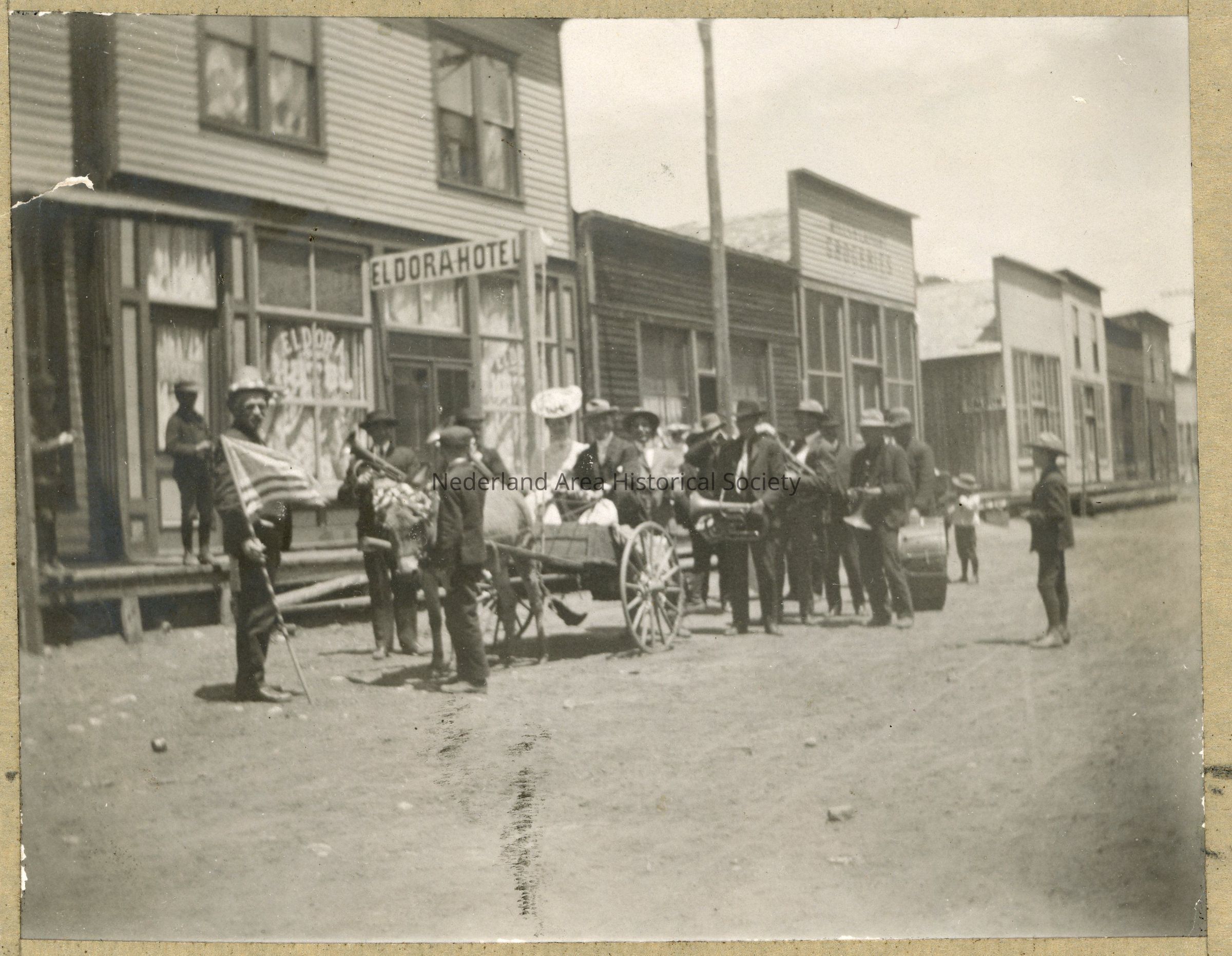 1. A bride and groom in a buggy drawn by mule and followed by a band in front of the Eldora Hotel. Typewritten and attached to back of photo: "The welcoming committee greets a bride and groom. This snap shot was made on the main street of Eldora about 1899, or 1900." Photo was cut from a scrapbook and has faded. Identification is typewritten and taped to back of photo. 4"x5" photo.