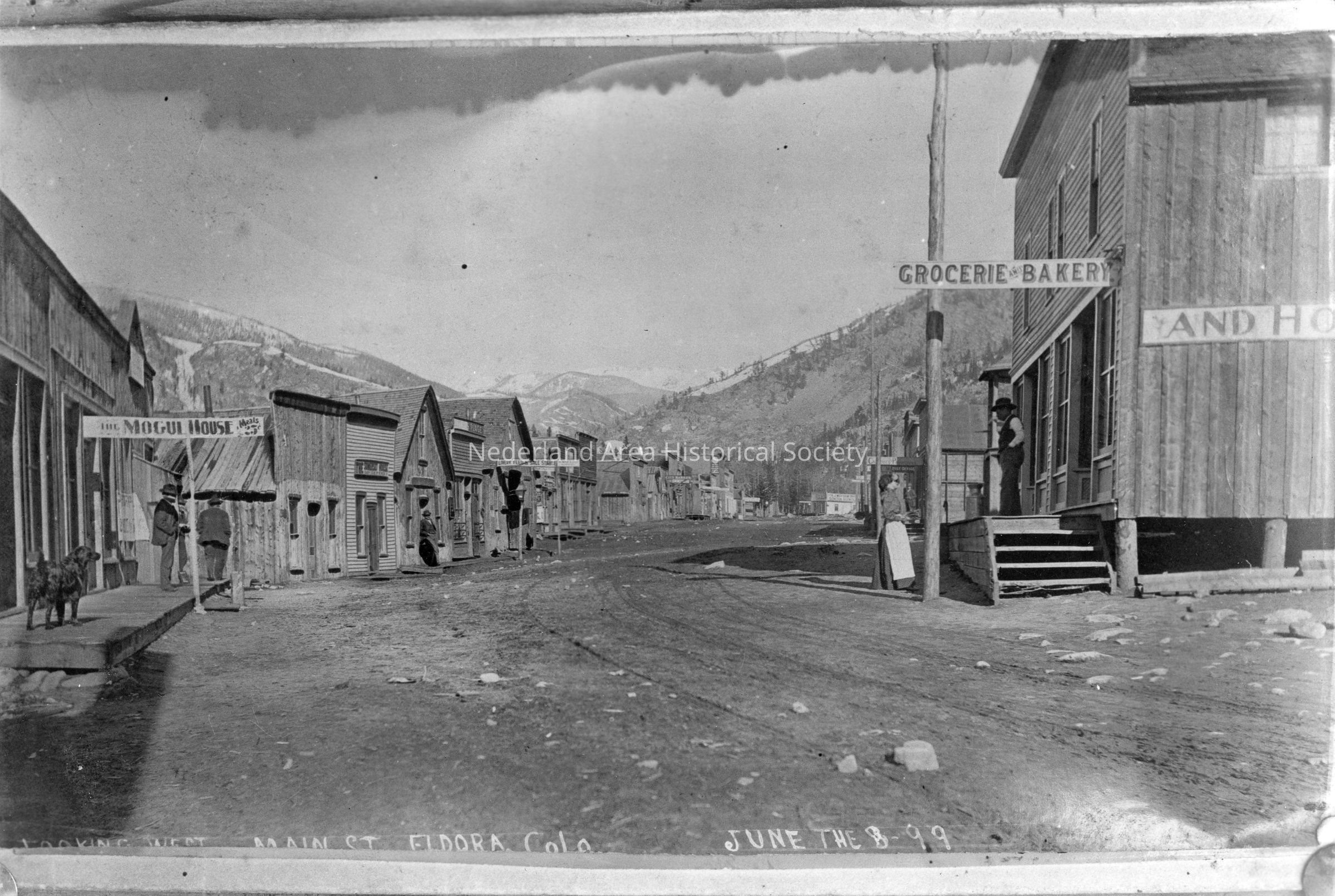 5. Looking West, Main St., Eldora, Colo., June the 8 - 1899. Back of 5"x7" print which is located in 2024.10.60 page 7: "Mogul House- Mrs. Jamieson, children Danny, Molly, Frances. Grocerie & Bakery and Hotel Wardell". Also 5"x7" negative which is blurry