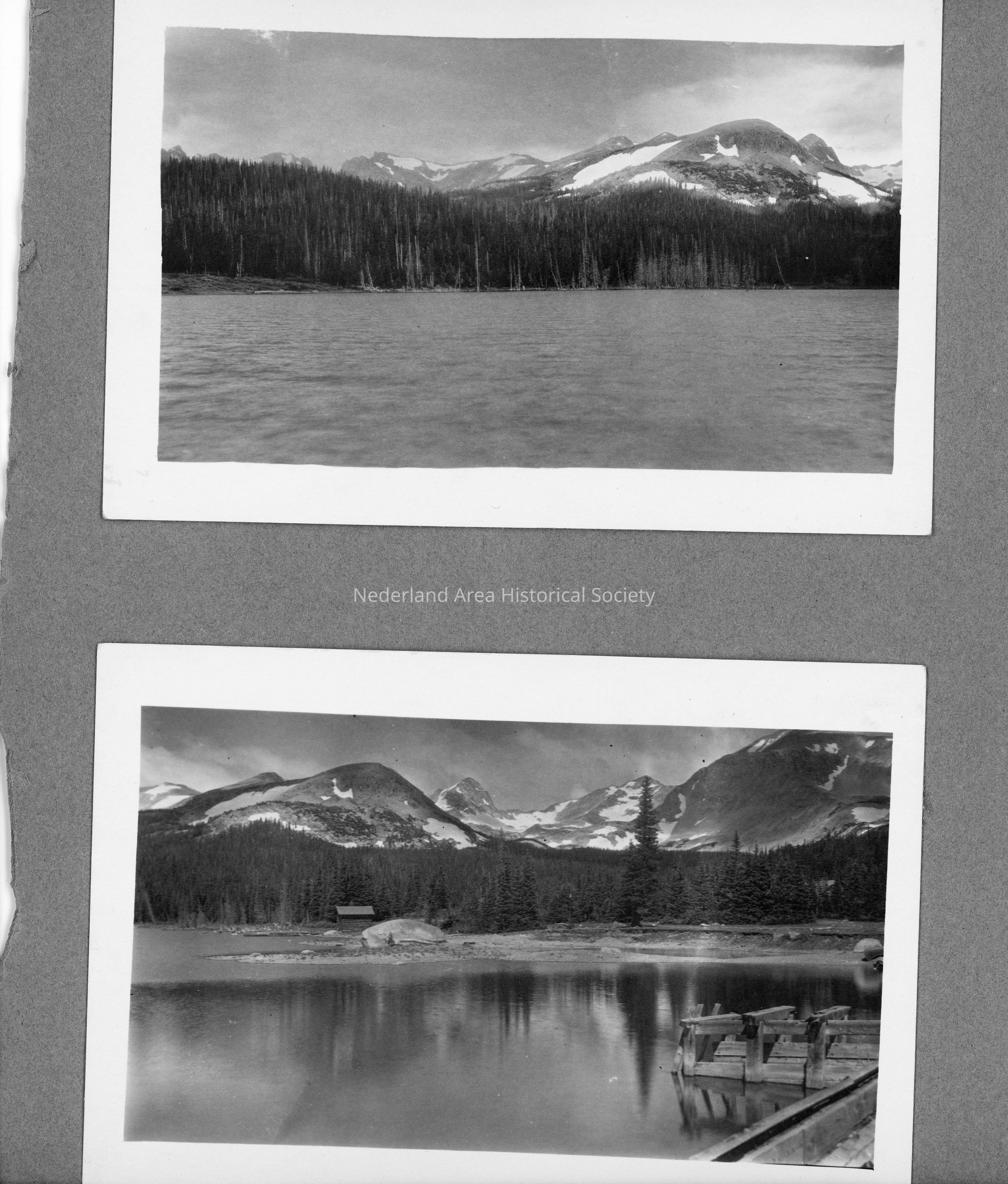 1. 4 gray scrapbook pages (not acid-free, photos are deteriorating) with photos of camping, fishing, and horseback trips. One page is labeled Stapps Lake. One is typewritten story "The Call of the Mountains" by Mary Roberts Rinehart. Small envelope of 4 photos that were on the back of the Mary Roberts Rinehart page.