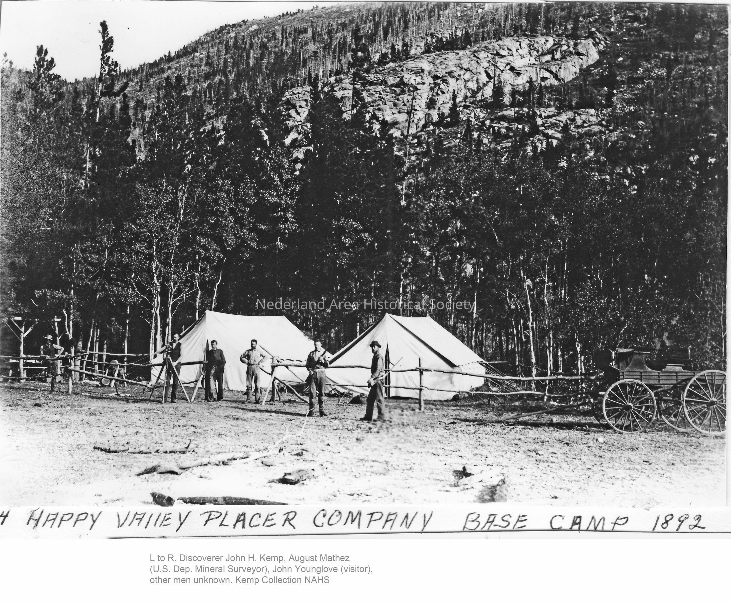 1. Happy Valley Placer Company Base Camp 1892. L to R Discoverer John H. Kemp, August Mathez (U.S. Dep. Mineral Surveyor), John Younglove (visitor), other men unknown. Digital copy only.