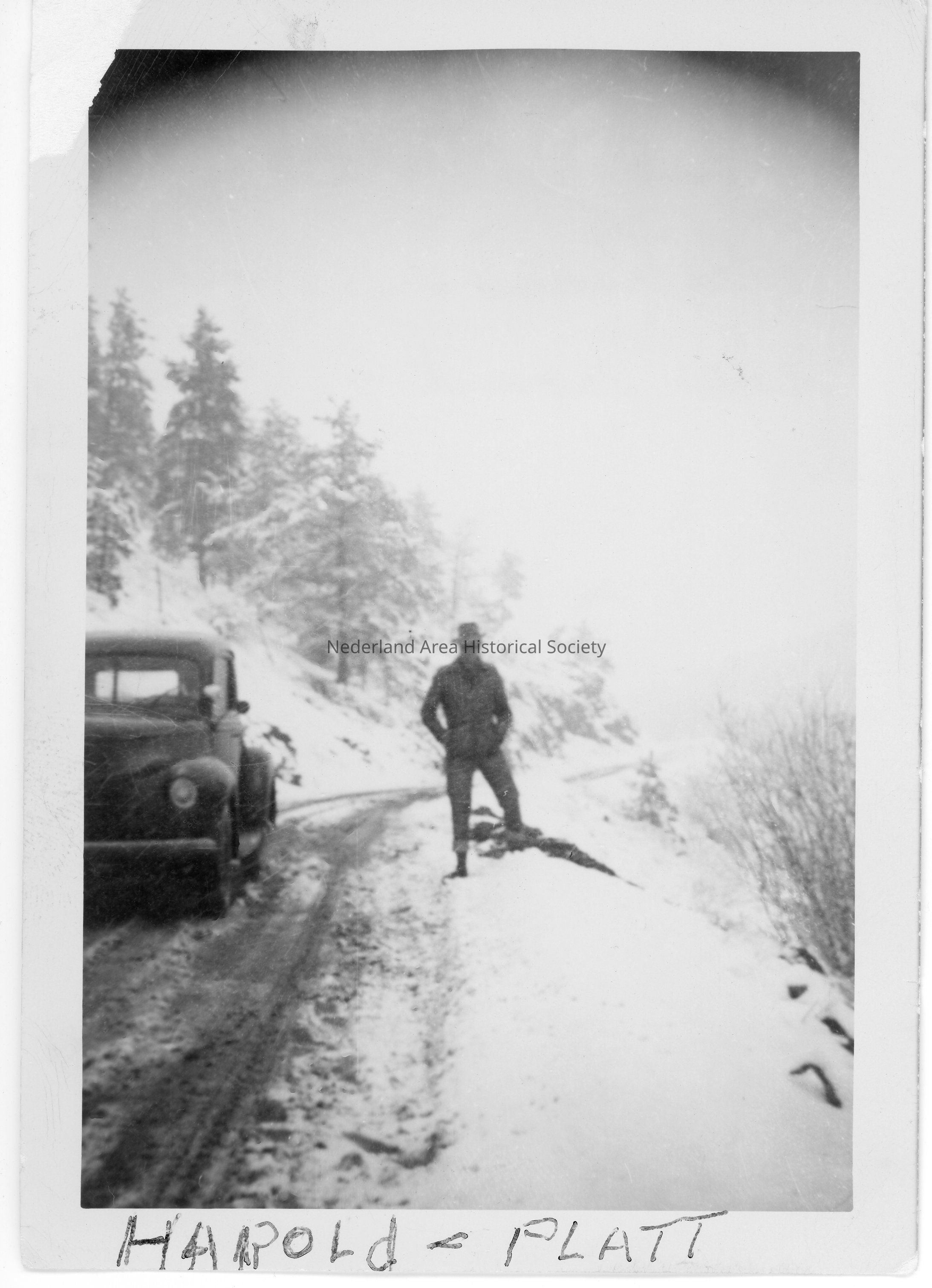 Front of photo identifies man as Harold Platt. From the back of the photo: "This is the electrician on the road."
