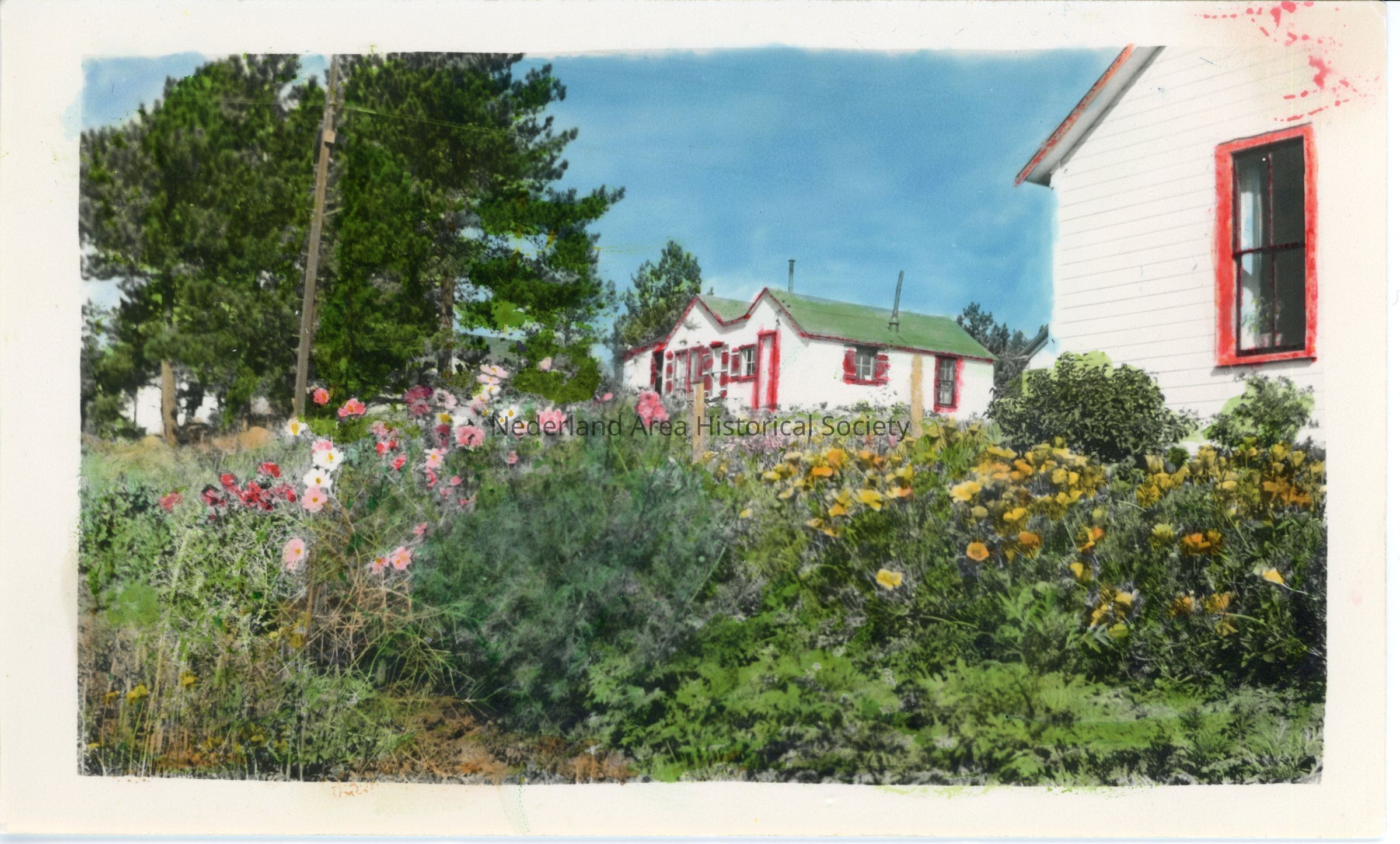 A house in Nederland, probably 1949-1963. Red house trim and flowers are hand-colored
