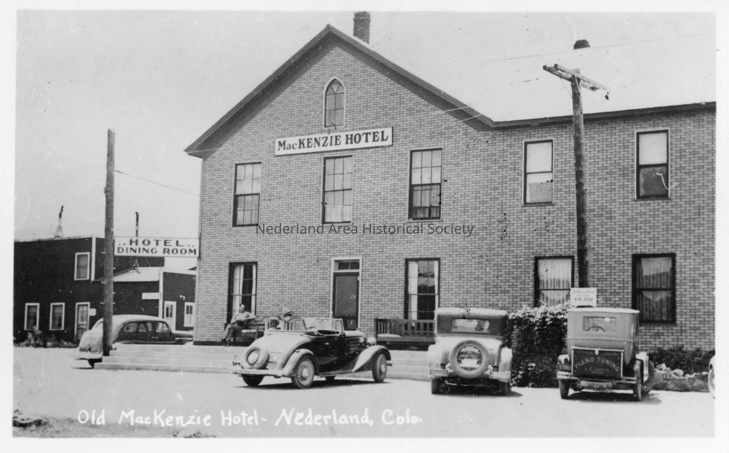 According to Mary Flarty, J.D. "Jack" MacKenzie arrived in Nederland in 1904. After his marriage to Mrs. Mollie Thomas, he bought the Hetzer Hotel, and they operated it as the MacKenzie Hotel until it was destroyed by fire on Dec. 4, 1939. Jack also served as Nederland's mayor for many years.Collection