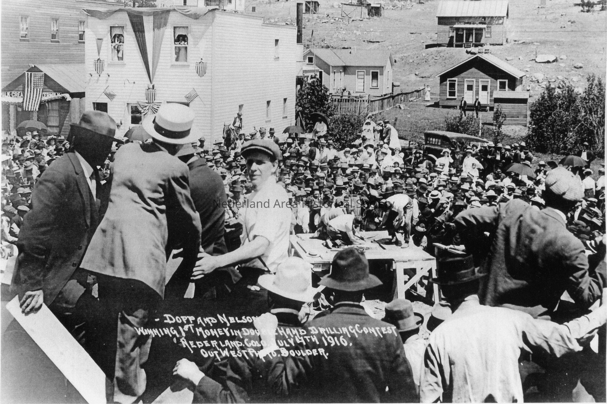 2. Dopp and Nelson Winning 1st Money DoubleHand Drilling Contest, Nederland, Colo. July 4th 1916, OutWest Photo, Boulder