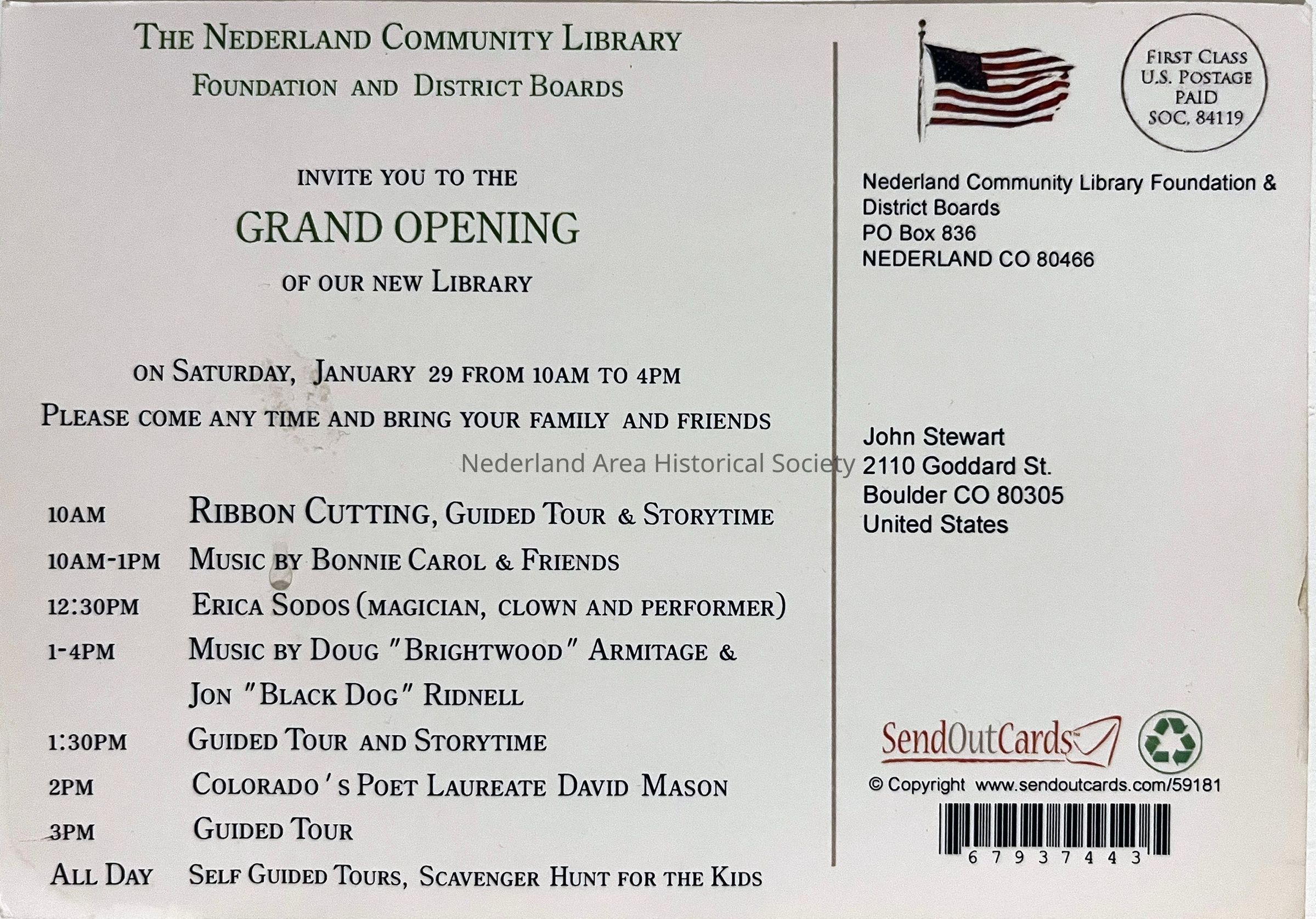 1. Postcard invitation to Grand Opening of new library on Saturday, January 29, 2011. Artwork by George Blevins. 4"x6"