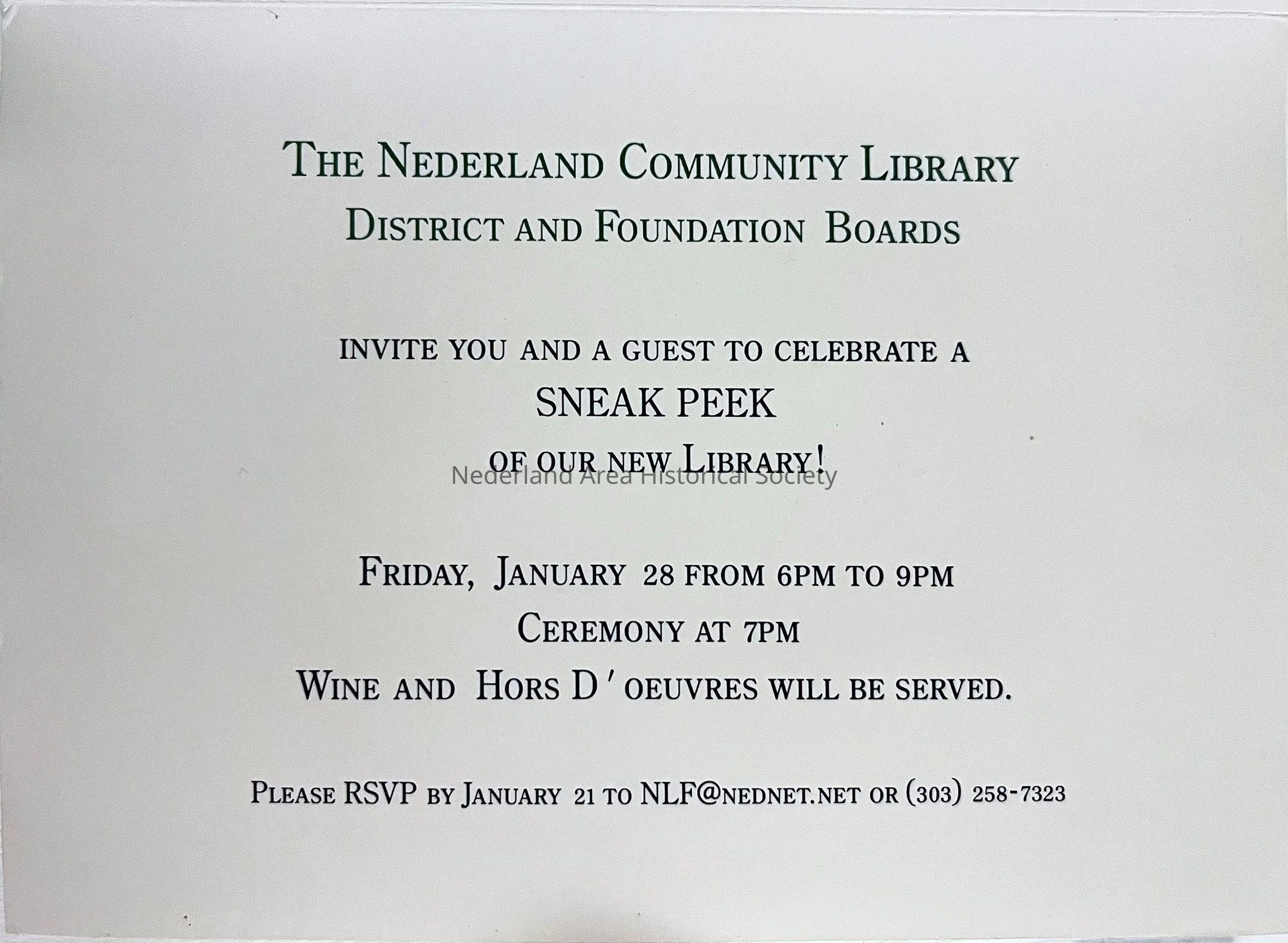 3. Greeting card, invitation to Sneak Peek before Grand Opening of Library. 5"x7"