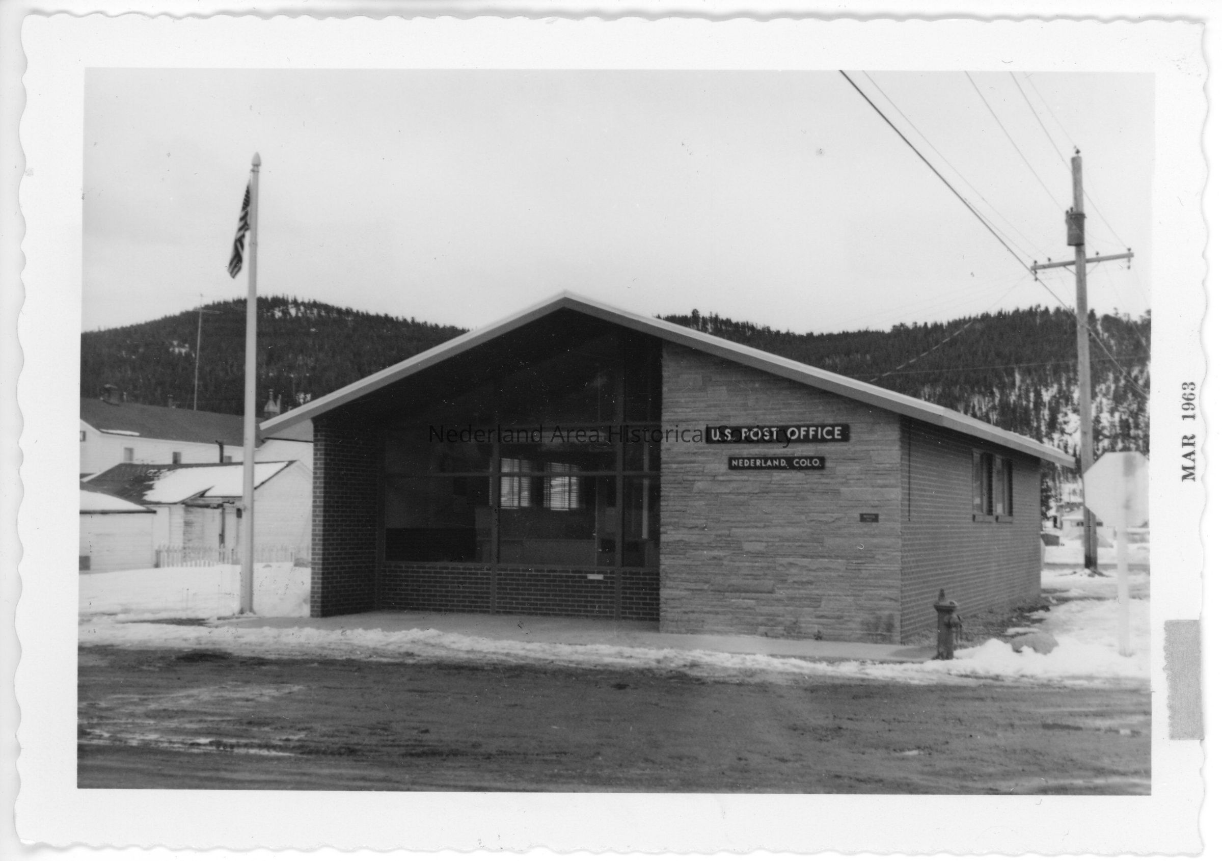 Snapshot of exterior of the Nederland Post Office dated Mar 1963. The Post Office was located at 74 Colo. Hwy 72.Collection