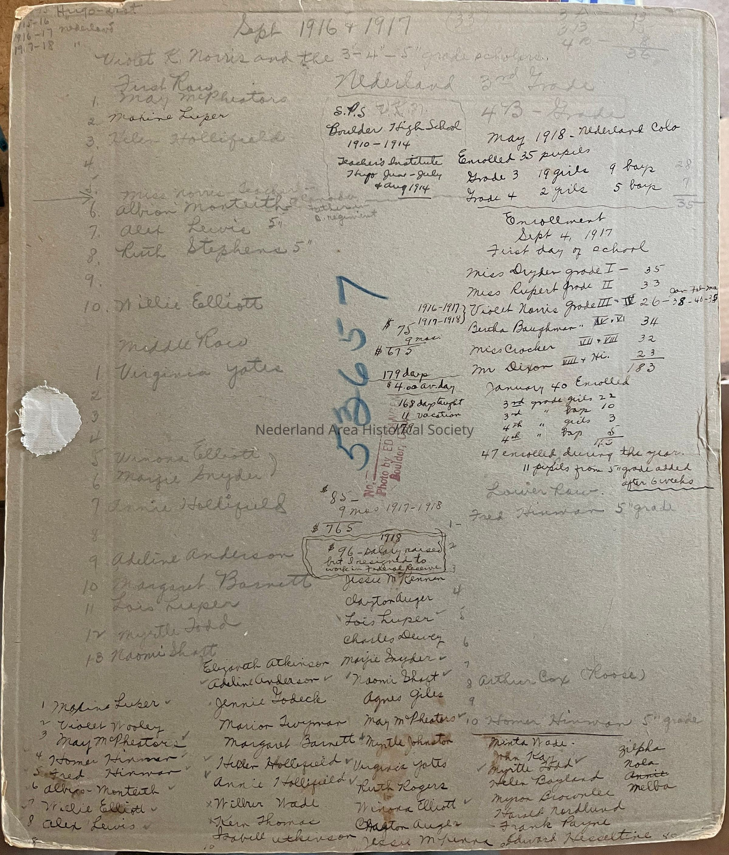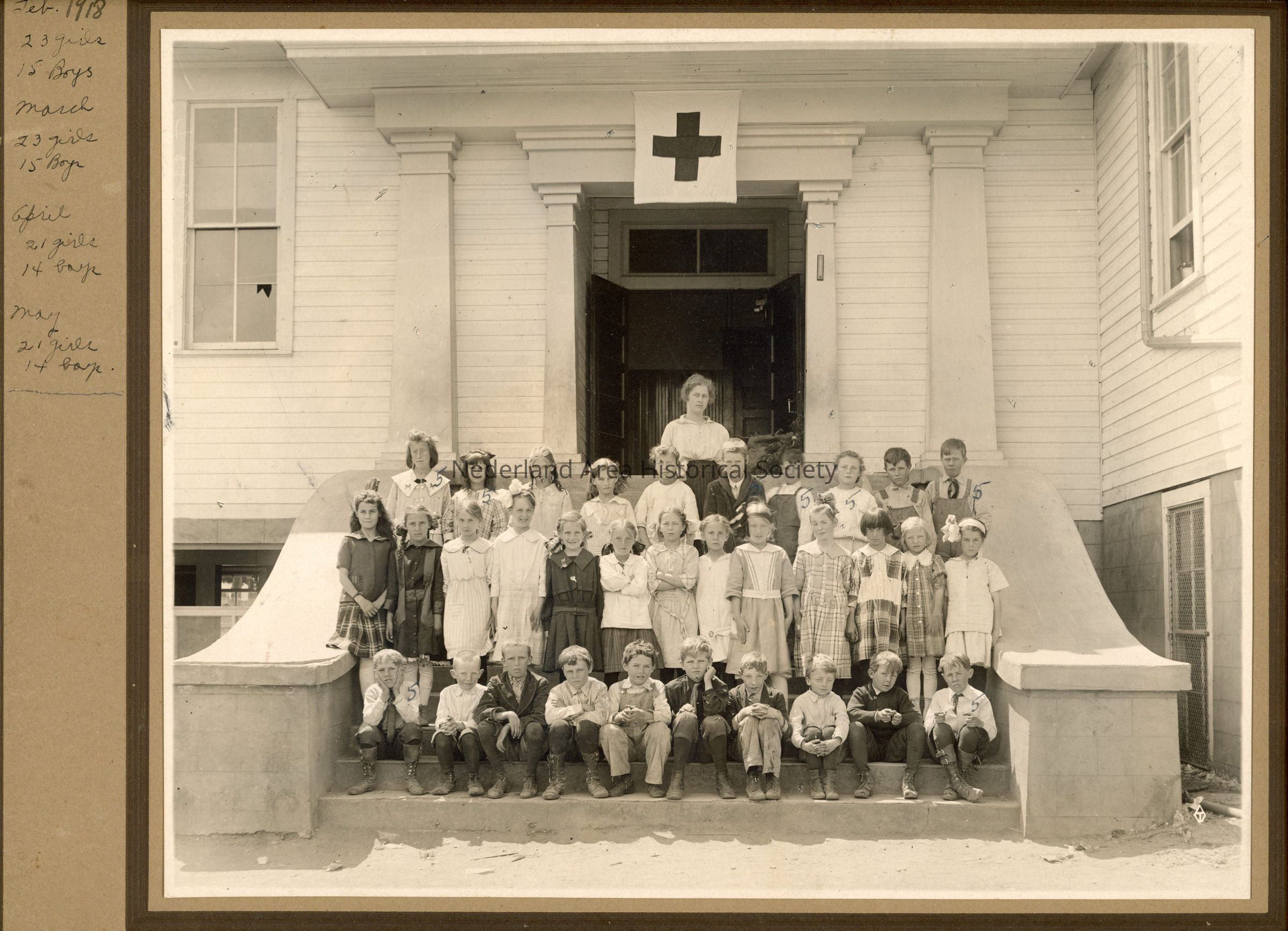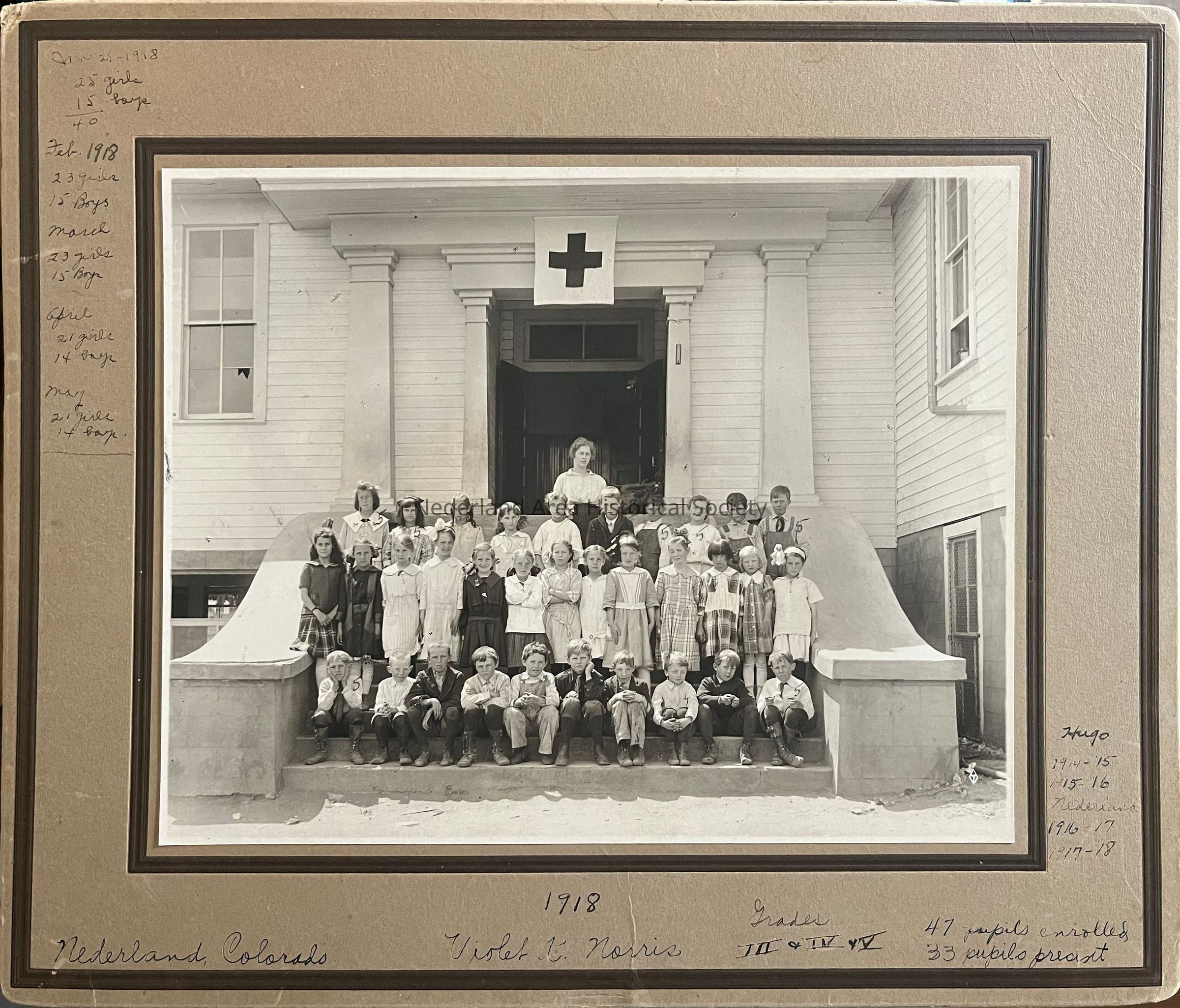 Photo of students grades 3, 4, and 5 on steps of Nederland School in 1918, Violet Norris teacher. Front of photo includes some enrollment statistics. Back of photo lists student names and enrollment and financial numbers.Collection