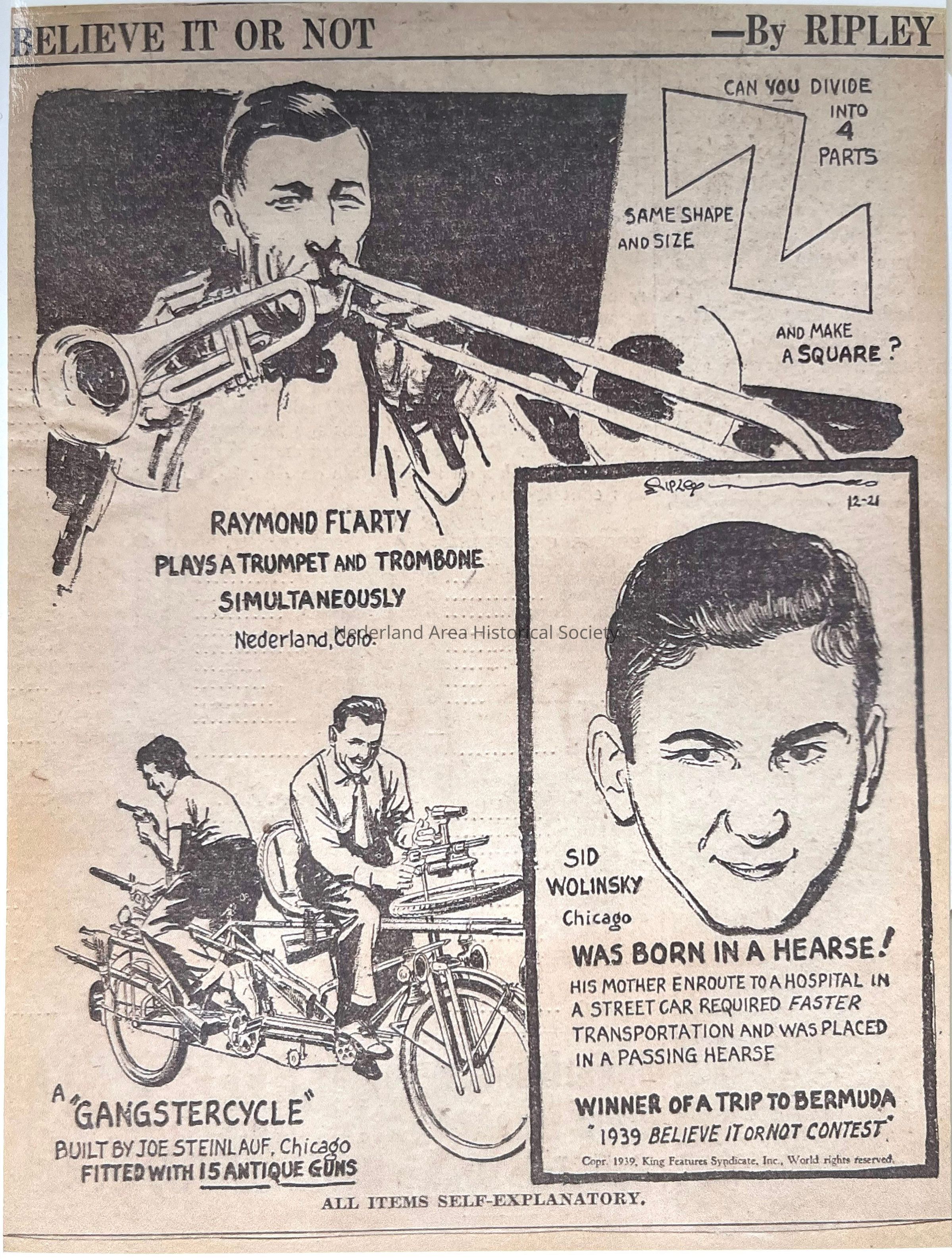 Photo of newspaper clipping of Ray Flarty playing trumpet and trombone simultaneously for Ripley's Believe It Or Not