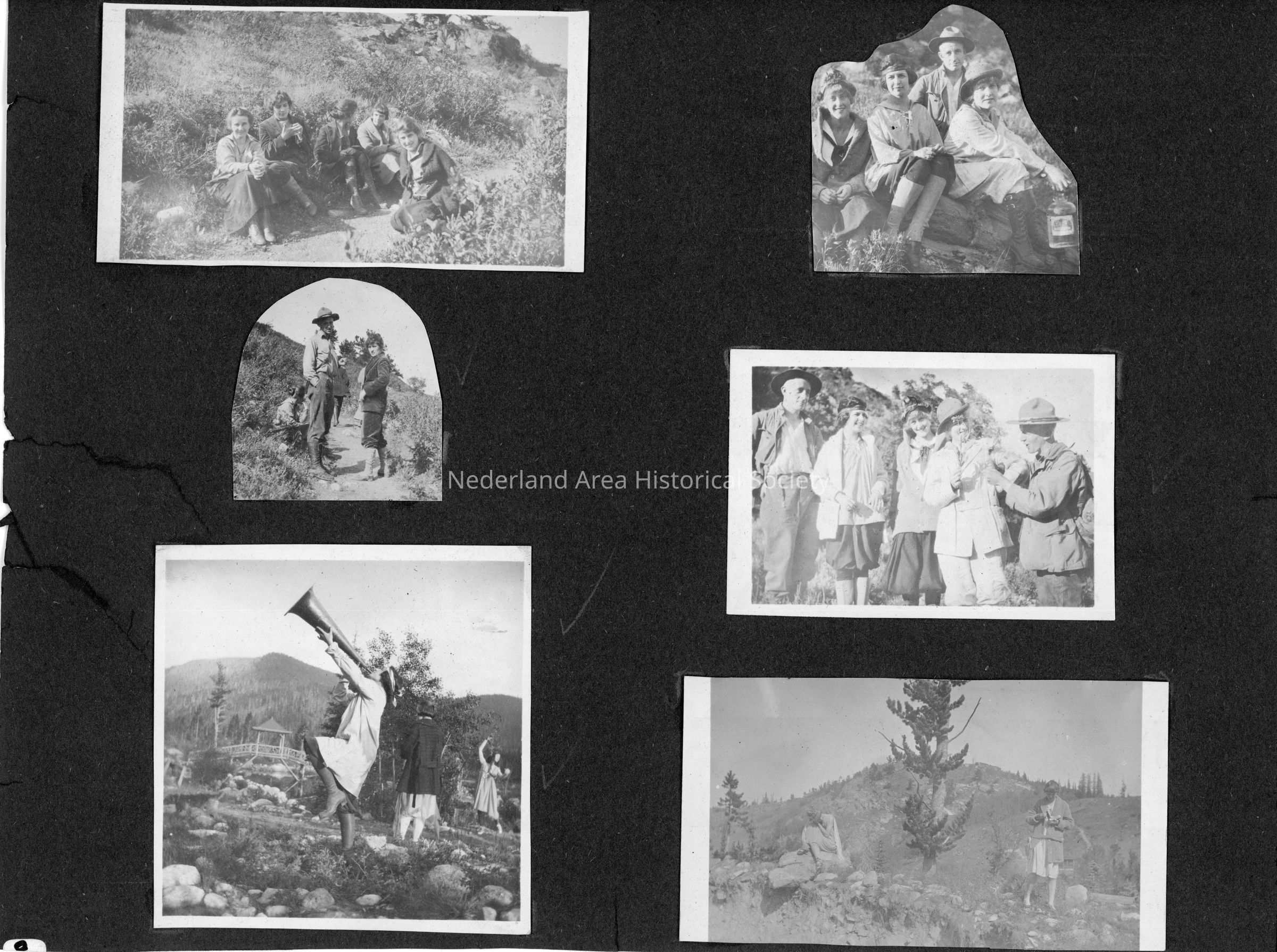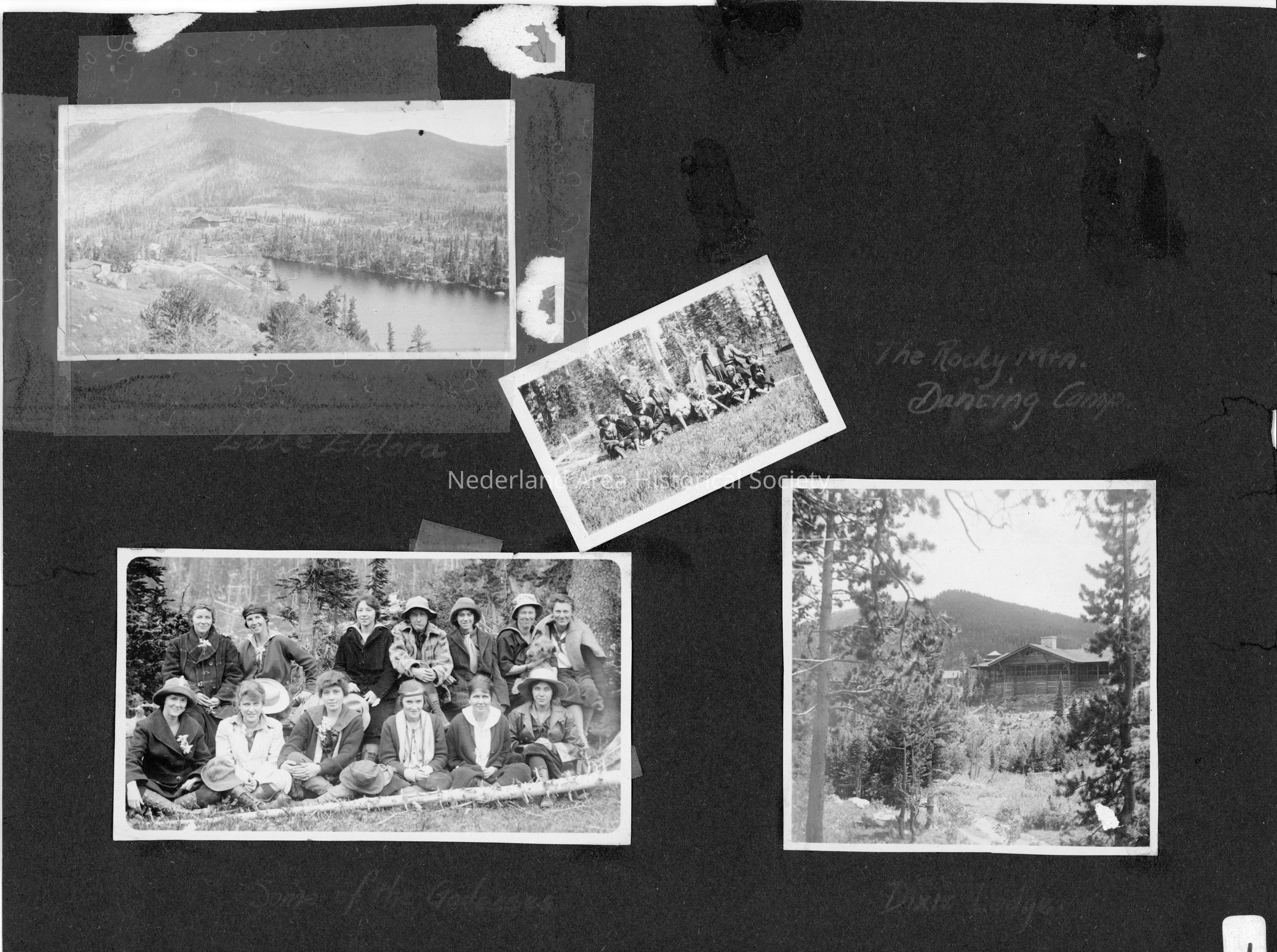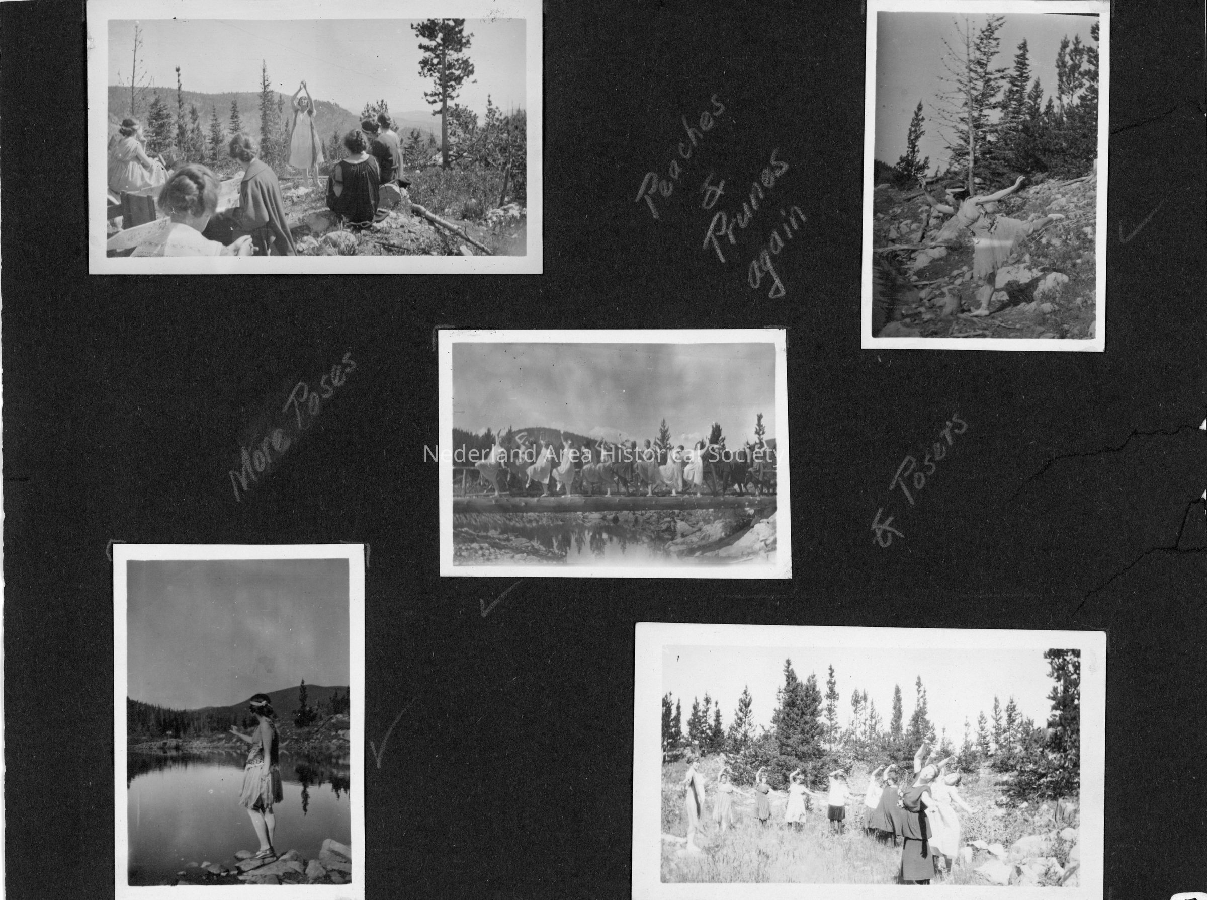Six loose scrapbook pages of photos of the Rocky Mountain Dancing Camp and Annie Brown's lodge. Some of the photos are cataloged individually. See 2024.10.14.