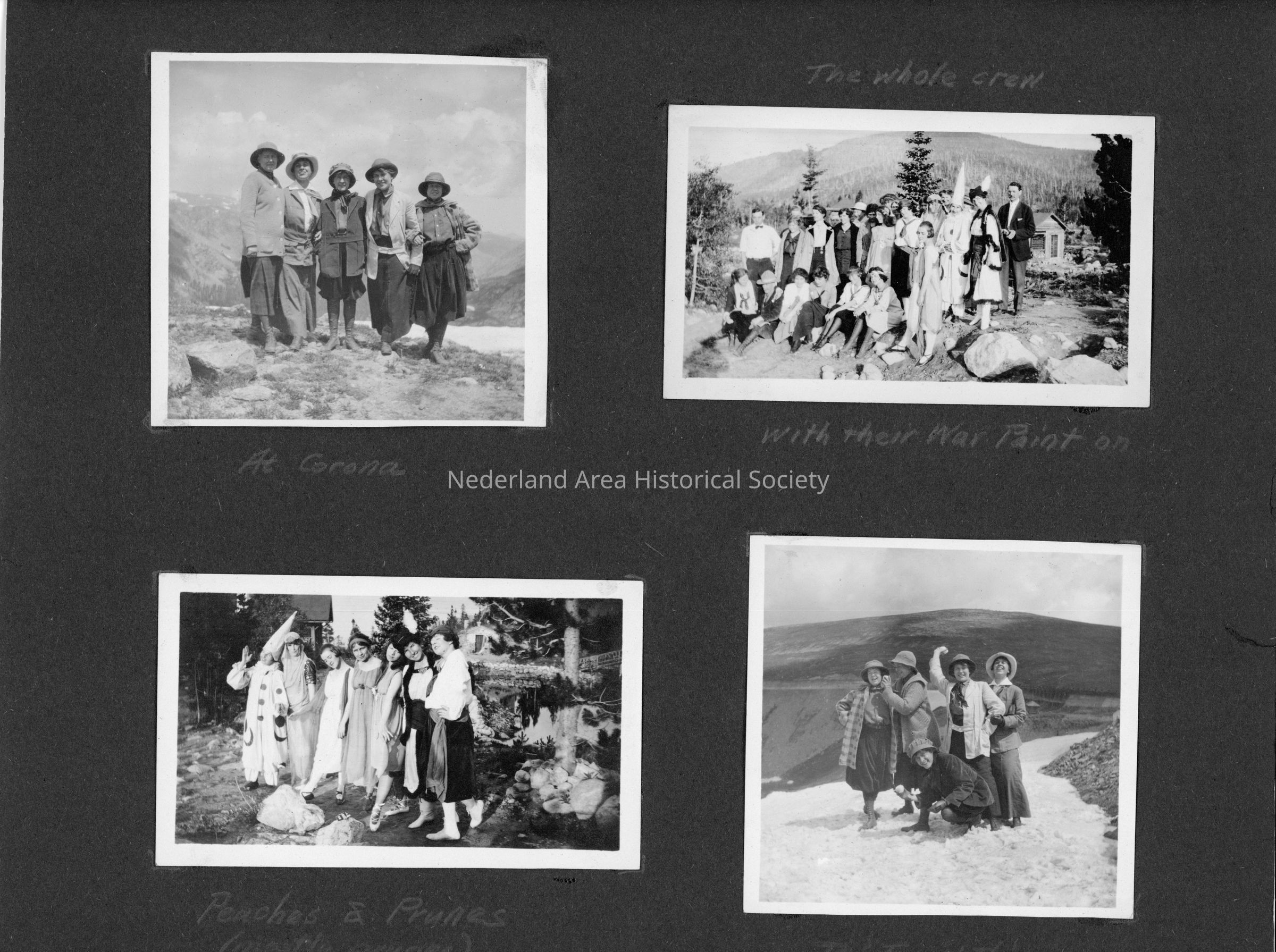 Page 3: Top left photo is labeled "At Corona". Top right: "The whole crew with their war paint on". Bottom left: Peaches & Prunes (mostly prunes)". Bottom right: "The Top of the World" (another name for Corona).