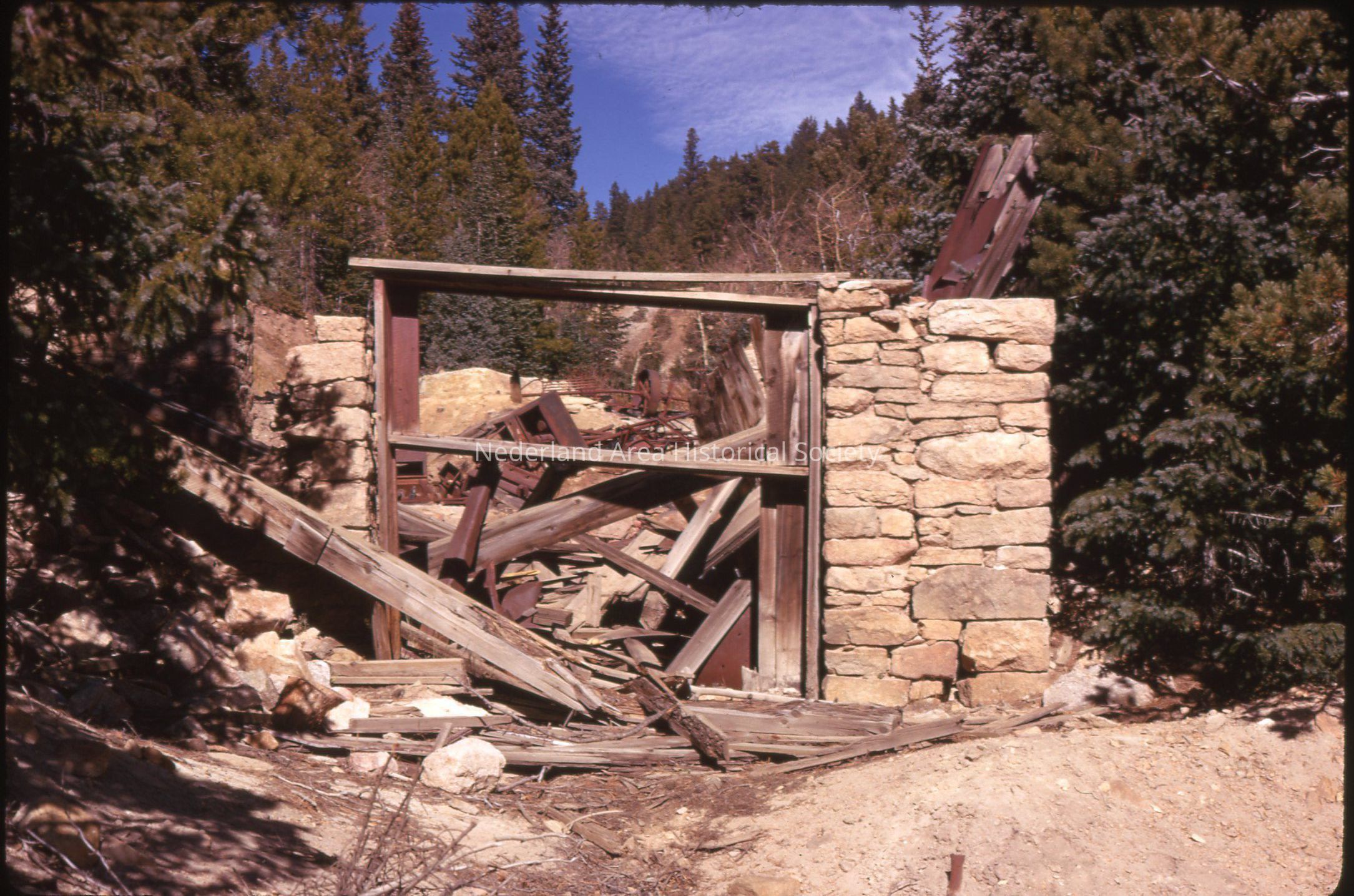 2. Burned-out stamp mill, rock wall, Ward, Colo. Color slide