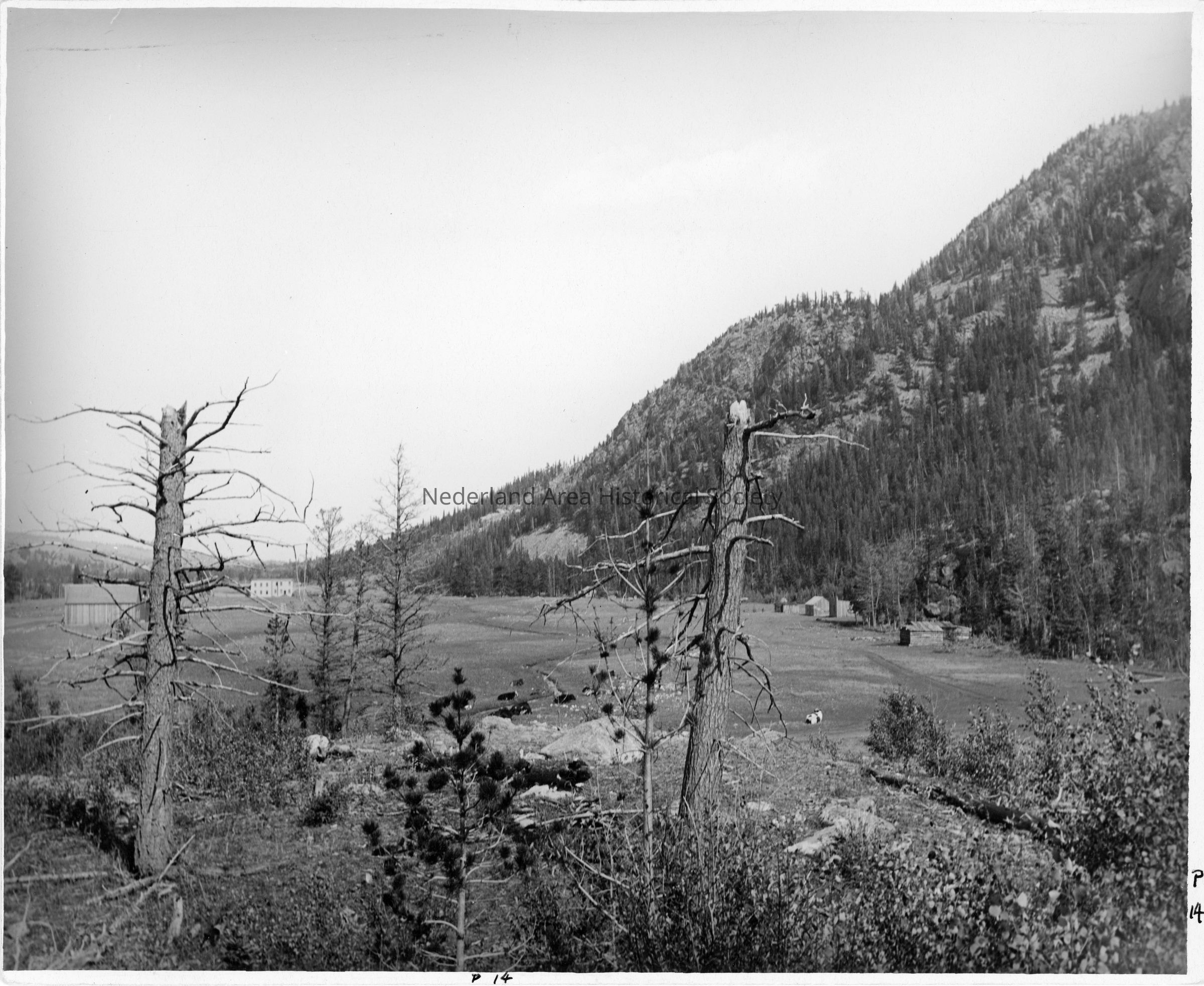 2 black and white prints, same view, 5"x7" and 8"x10". Typewritten description on back of larger print: "A view of Sulphide, 1899. Note the few buildings of the embryo town. The two-story building to the right of the broken tree is the St. Julian Hotel built near the shore of Sulphide Lake. Tennessee Mtn. to the right. Photograph by Harry H. Lake, Central City."Context