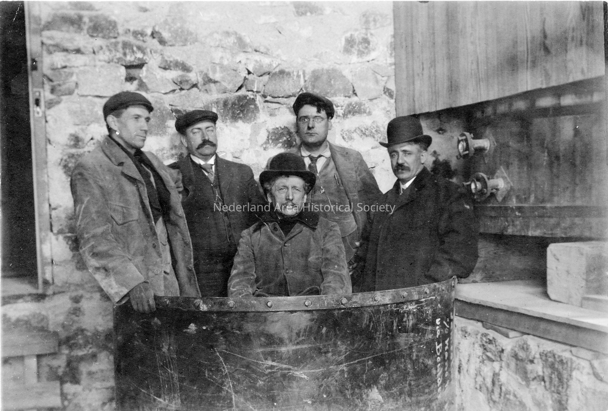 7. Group of men, possibly investors, standing in bucket with shipping instructions to Wano via Boulder
