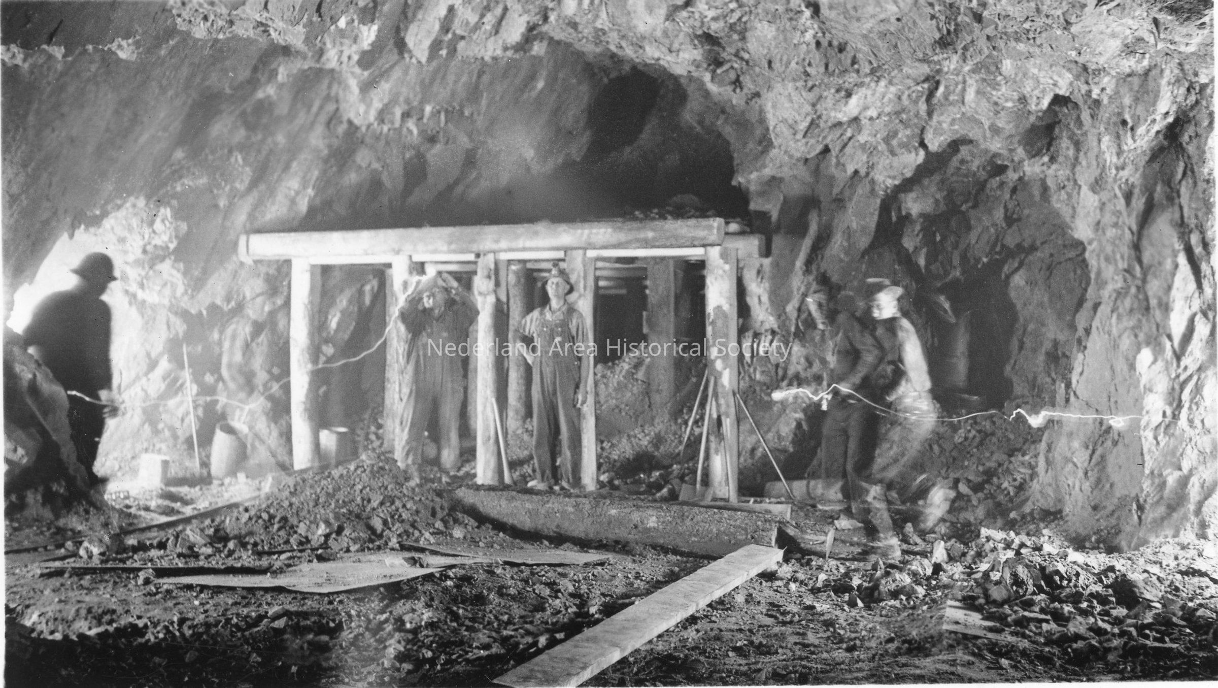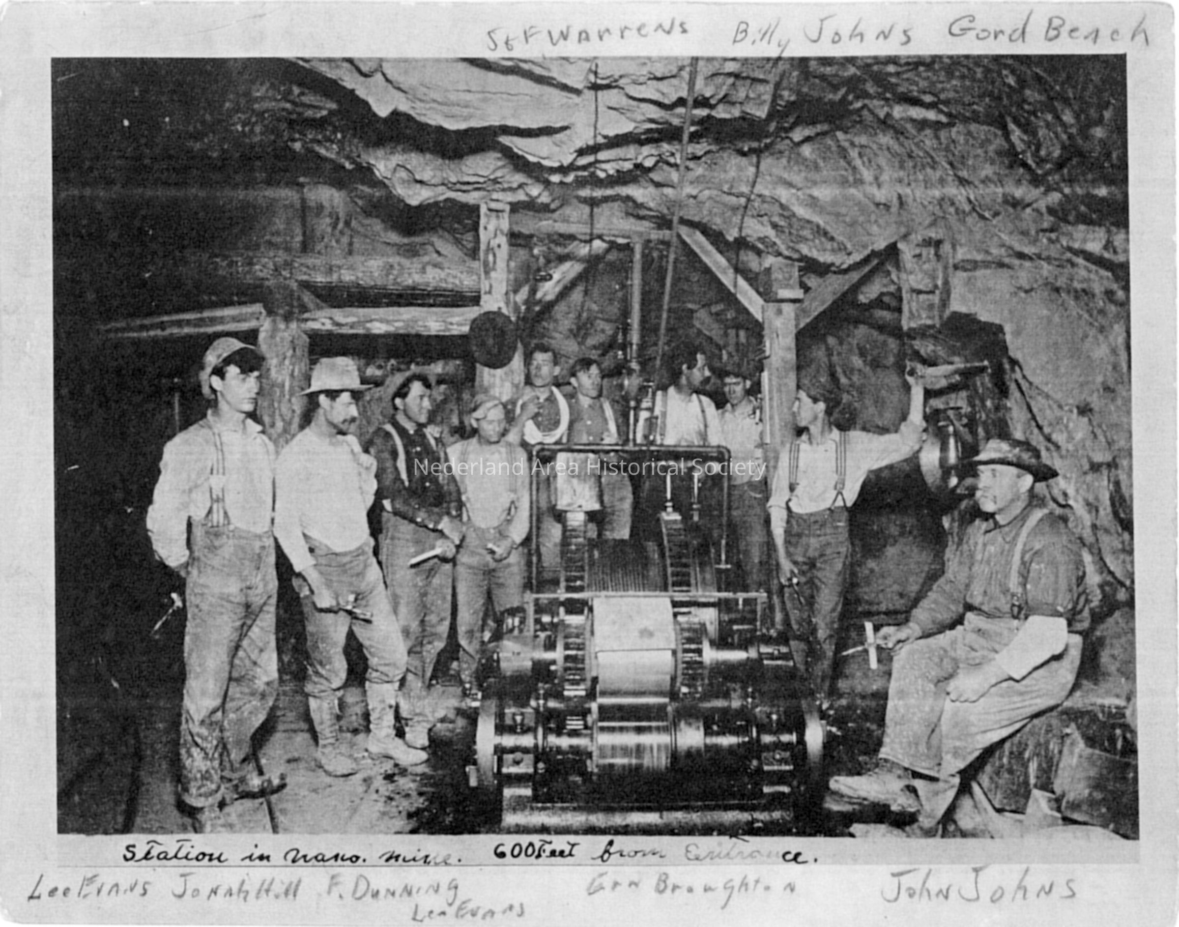 10. Station in Wano Mine. 600 Feet from Entrance. Identified (on bottom) are Lee Evans, Jonah Hill, F. Dunning, Le- Evans, Ern Broughton, and John Johns. (On top): S-F Warrens, Billy Johns, and Gord BeachContext
