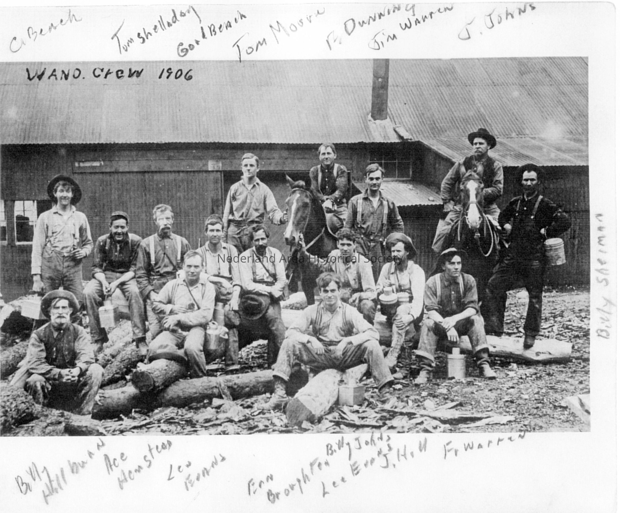 1. Wano Crew 1906 identified as (front) Billy Hillburn, Ace Hemstead, Lew Erans(?), Ern Broughton, Bill Johns, Lee Evans, J. Hall, Fr Warren. (Back) C. Beach, Tom Shelladay, Gord Beach, Tom Moore, F. Dunning, Jim Warren, J. Johns, and Billy Sherman (far right).