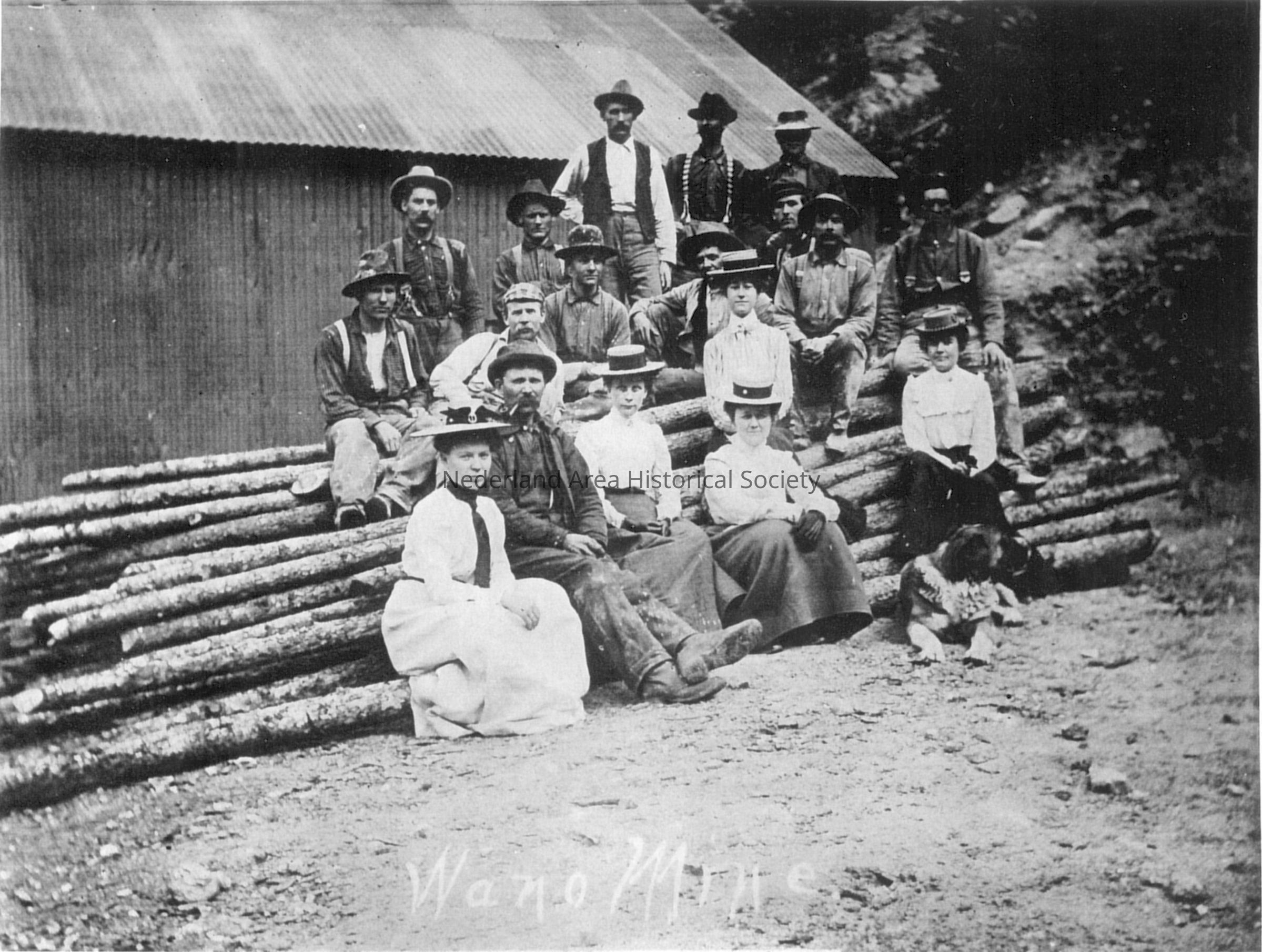 4. Wano Mine. Men and women and dog sitting on pile of logs.