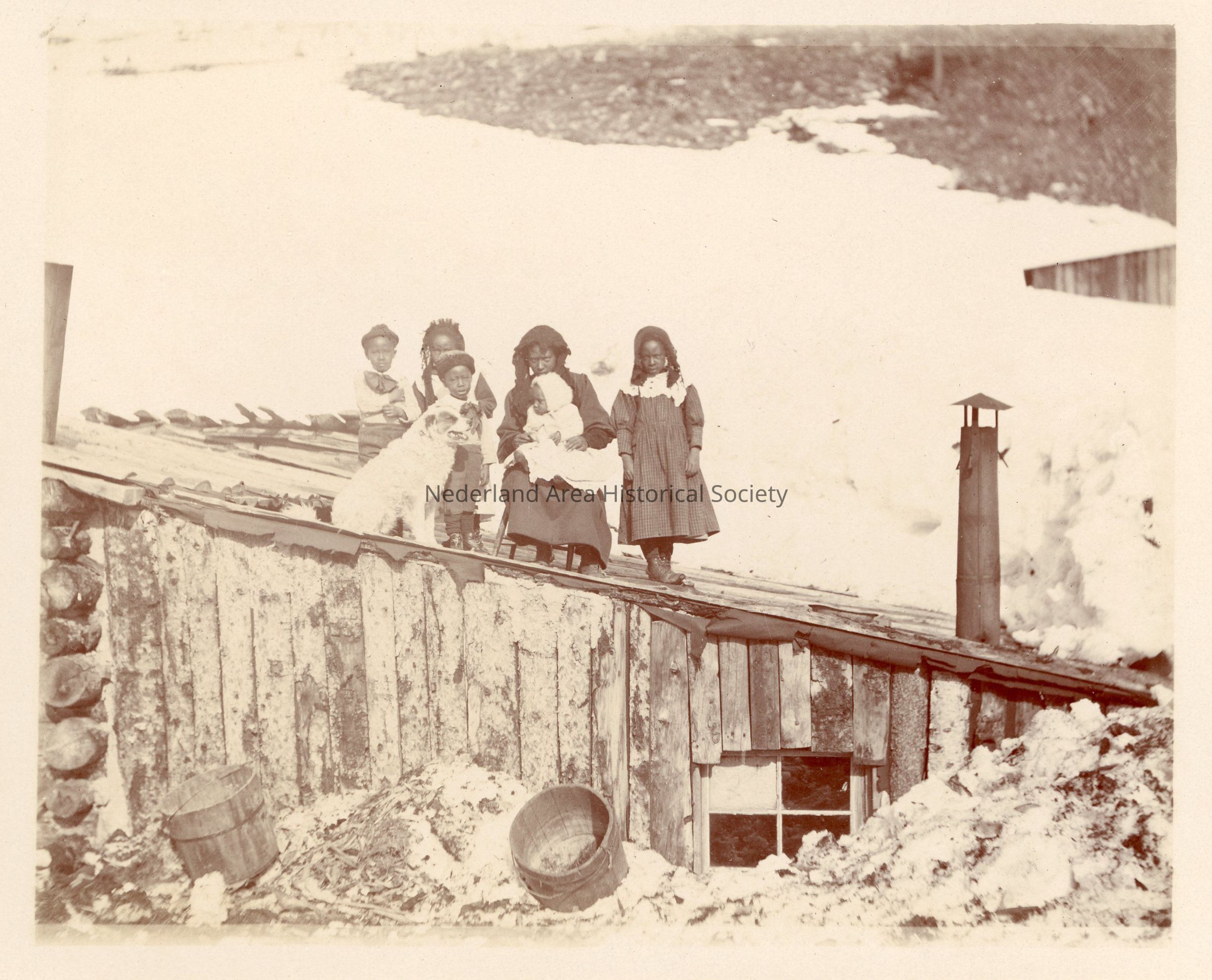 A Black woman sits in a chair and holds a baby, surrounded by four other children and a dog, on the roof of a cabin. Snow is on the ground in the background. Location and date unknown.Collection