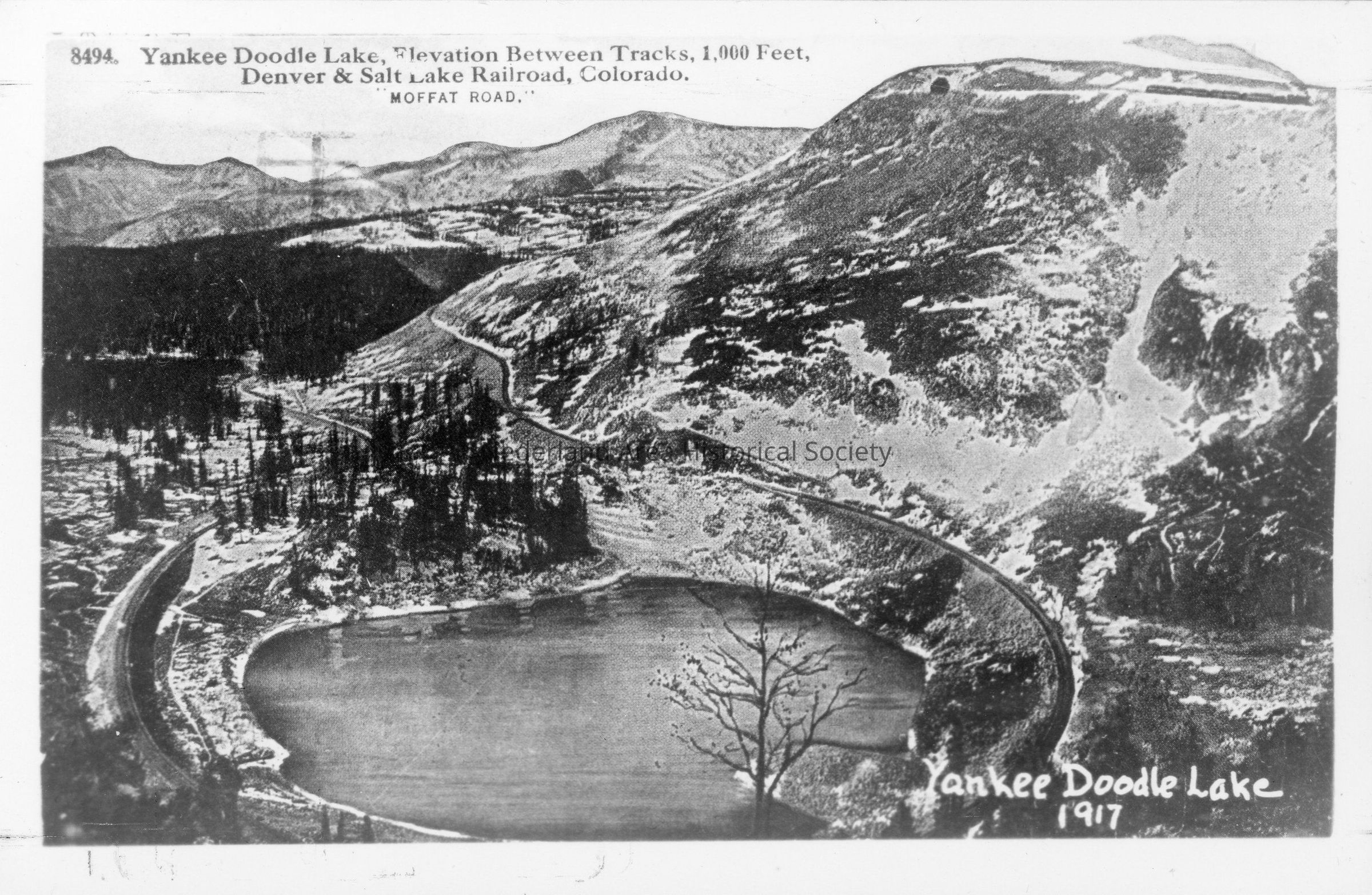 Photo Post Card of Yankee Doodle Lake 1917. Elevation Between Tracks 1,000 Feet, Denver & Salt Lake Railroad, Colorado. Moffat Road. Photo shows railroad tracks around the lake with a snowshed and the Needle's Eye Tunnel in the top right with a train.