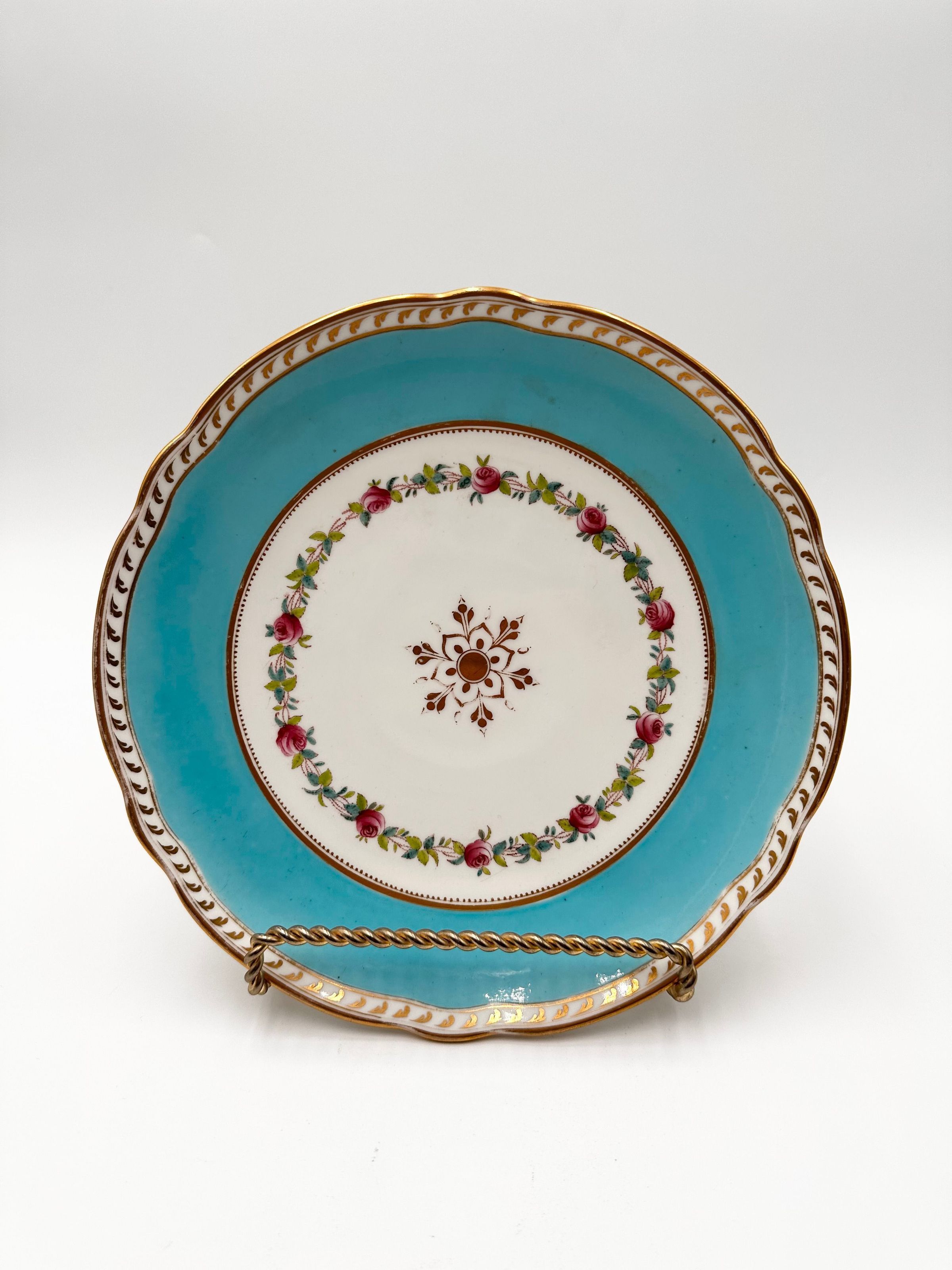 Blue and gold Sèvres cake plate (one of a matched pair). The center of the plate is white decorated around the edge with a garland of pink roses and gold medallion in the center.Acquisition