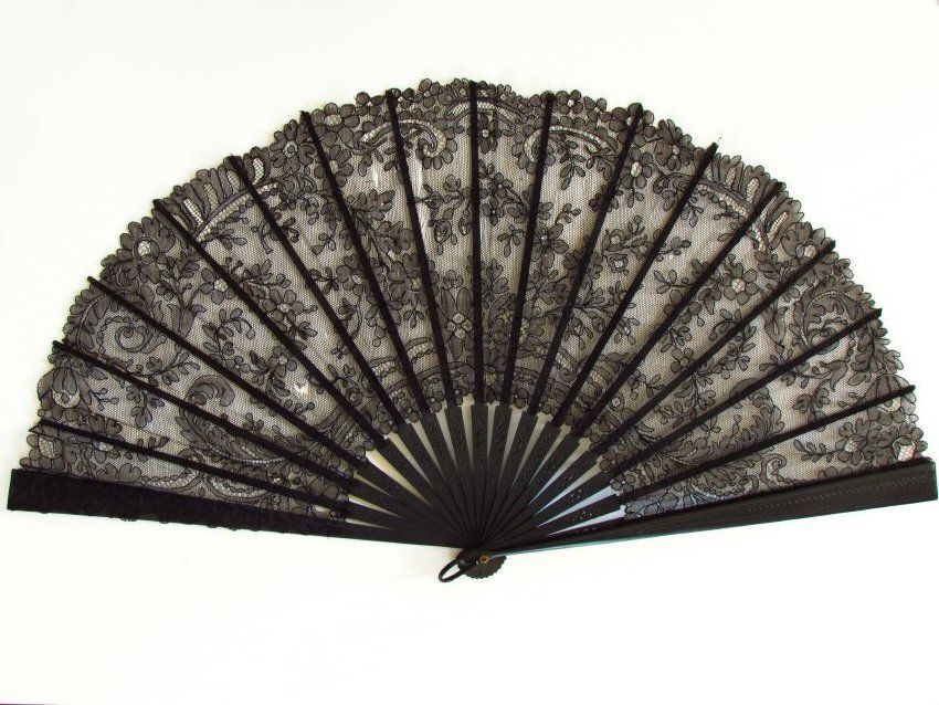 This dramatic black lace leaf and black wooden stick fan is in exceptional condition.