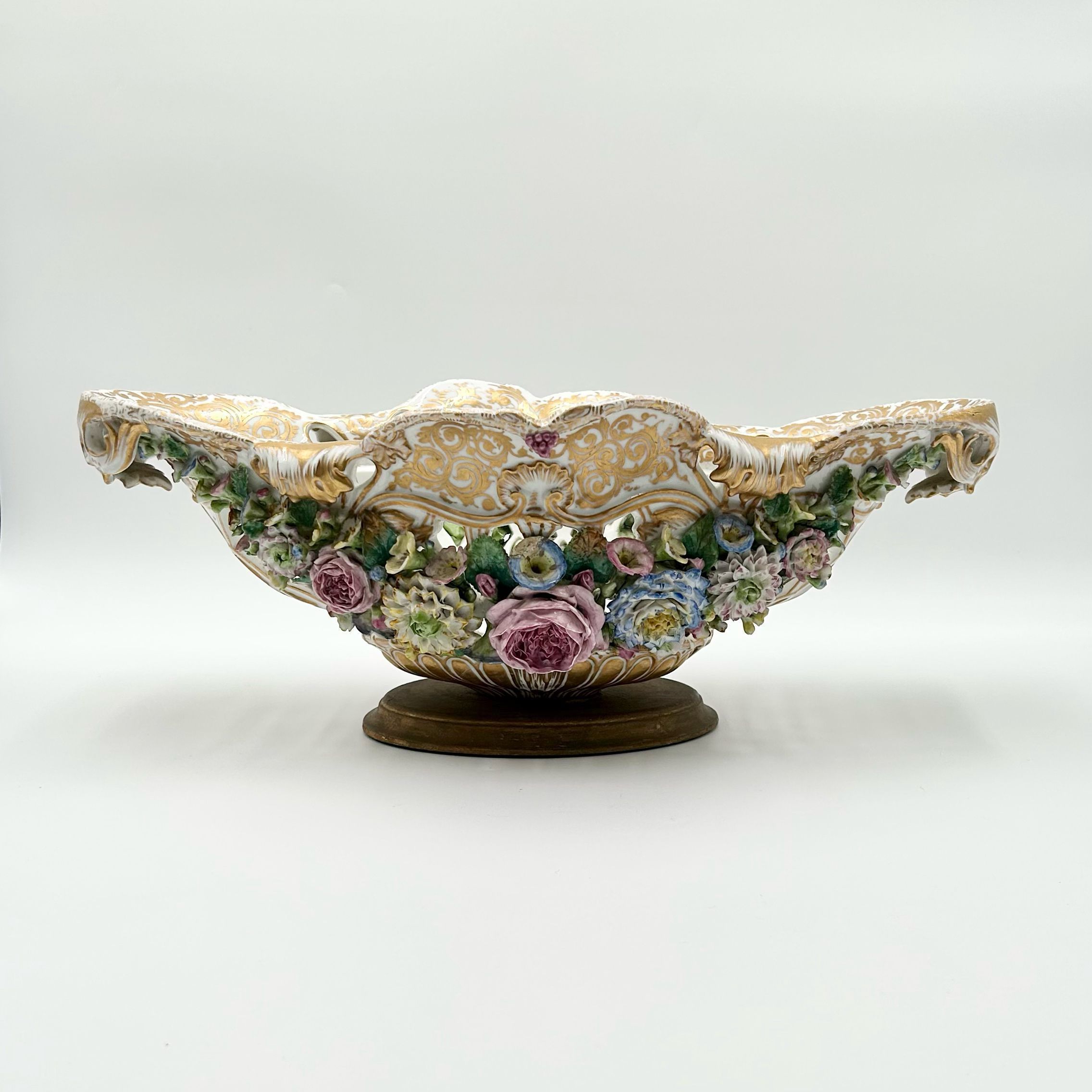 Oval Dresden porcelain open latticework fruit bowl with 3 dimensional flowers and a gold rim on a wooden base.