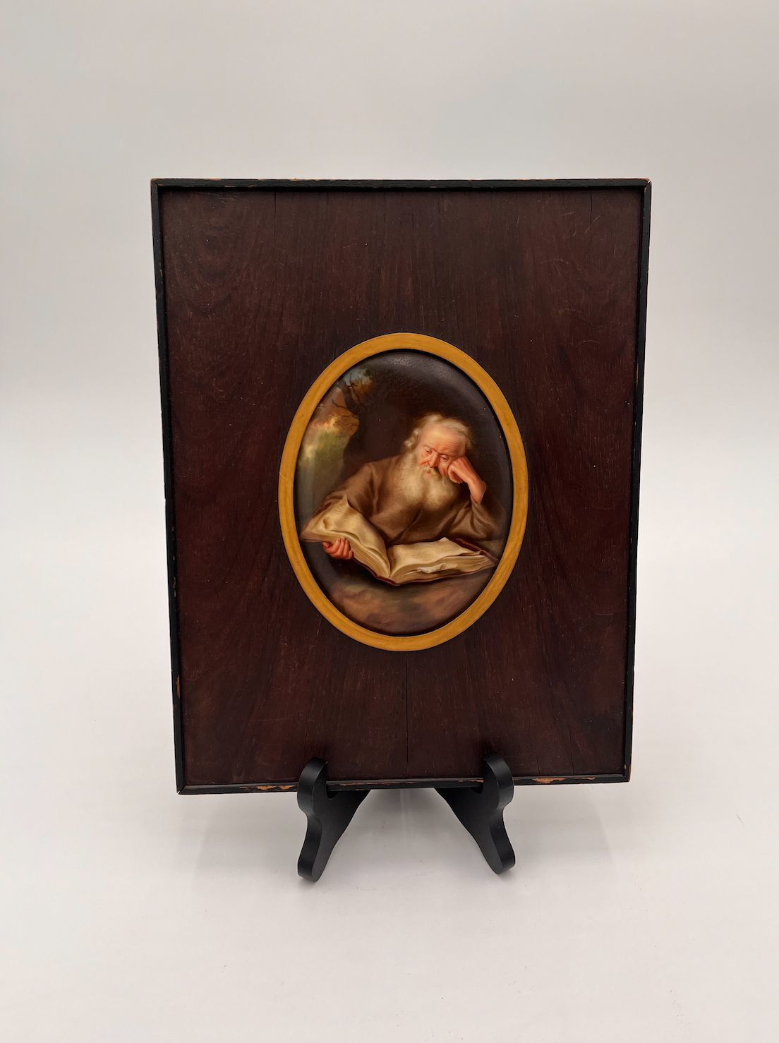 This miniature is painted in oil on porcelain and is after a painting of the Dutch artist Salomon Koninck (1609-1656) entitled “The Hermit” (1643, Gemäldegalerie Alte Meister, Dresden, Germany). It depicts Saint Jerome who lived as a hermit in the desert of the southwest of Antioch. The Saint is known for translating the Bible from Greek into Latin and is therefore often represented as a scholar while reading.