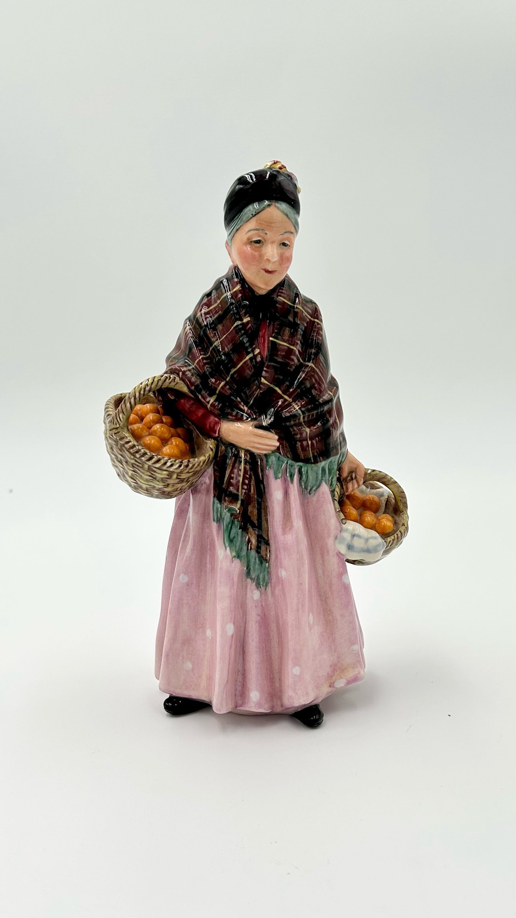 This figurine entitled "The Orange Lady" bears the original mark of the British ceramic manufacturer Royal Doulton producing collectibles and tableware (originated in London in 1815).