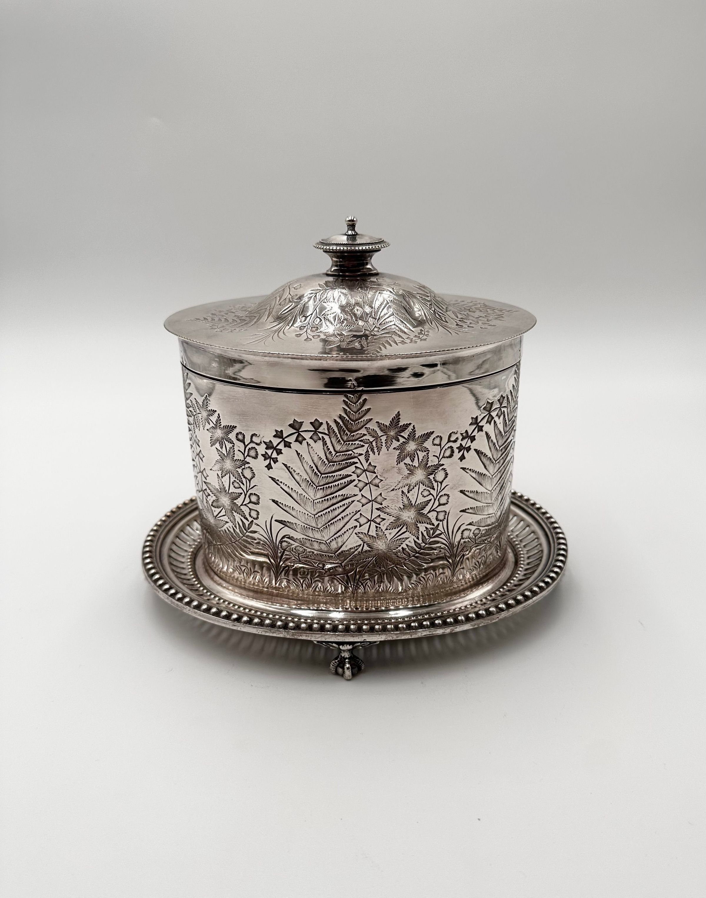 On the lamp table beside the northwest window of the Neill-Cochran House Museum's back parlor sits a Sheffield silver oval biscuit box made in England, c. 1900. The box has a hinged cover and an urn finial on an oval footed tray. It is decorated on the top and sides with etchings of summer foliage.