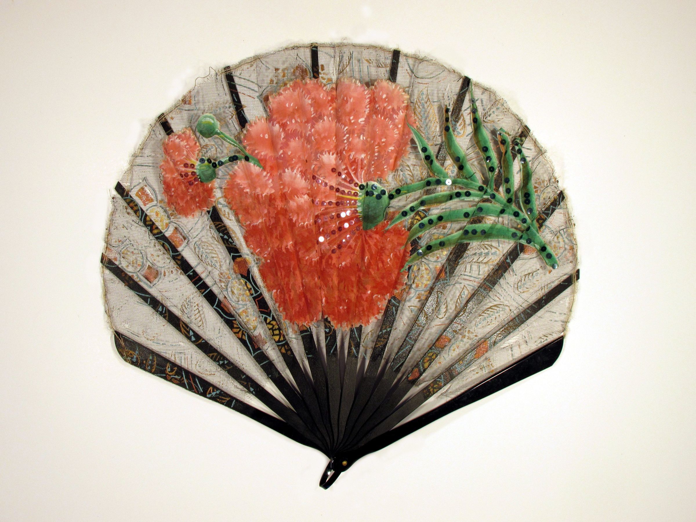 This delicate but dramatic fan leaf is made of tulle, with stenciled stylized floral