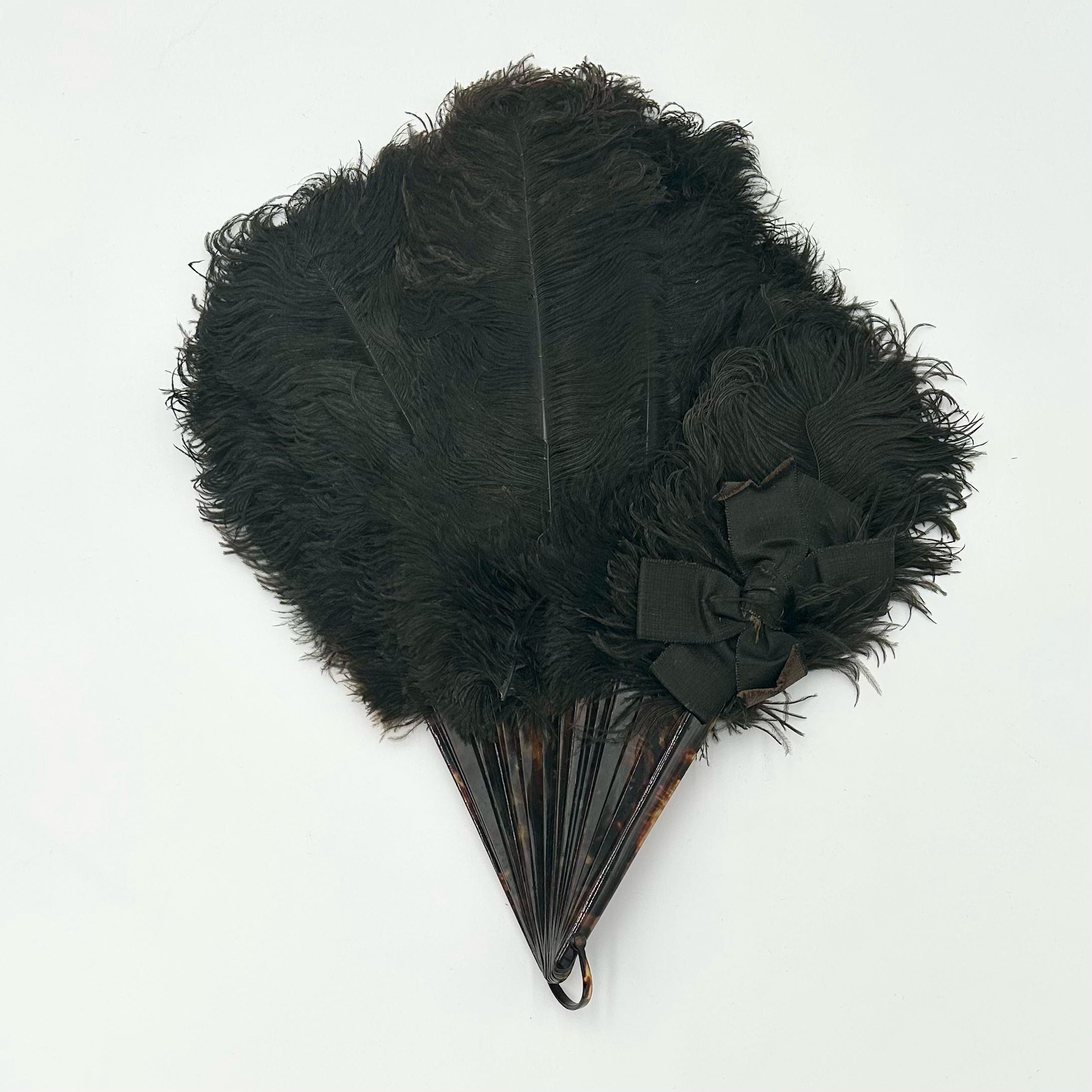This stunning evening fan features black ostrich feathers, a black silk ribbon, and
