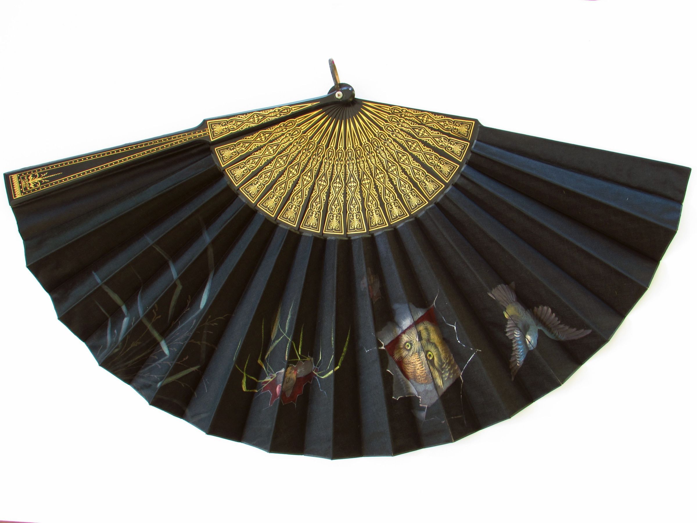 Black silk satin leaf with gilded black wooden sticks. This dramatic fan reflects a